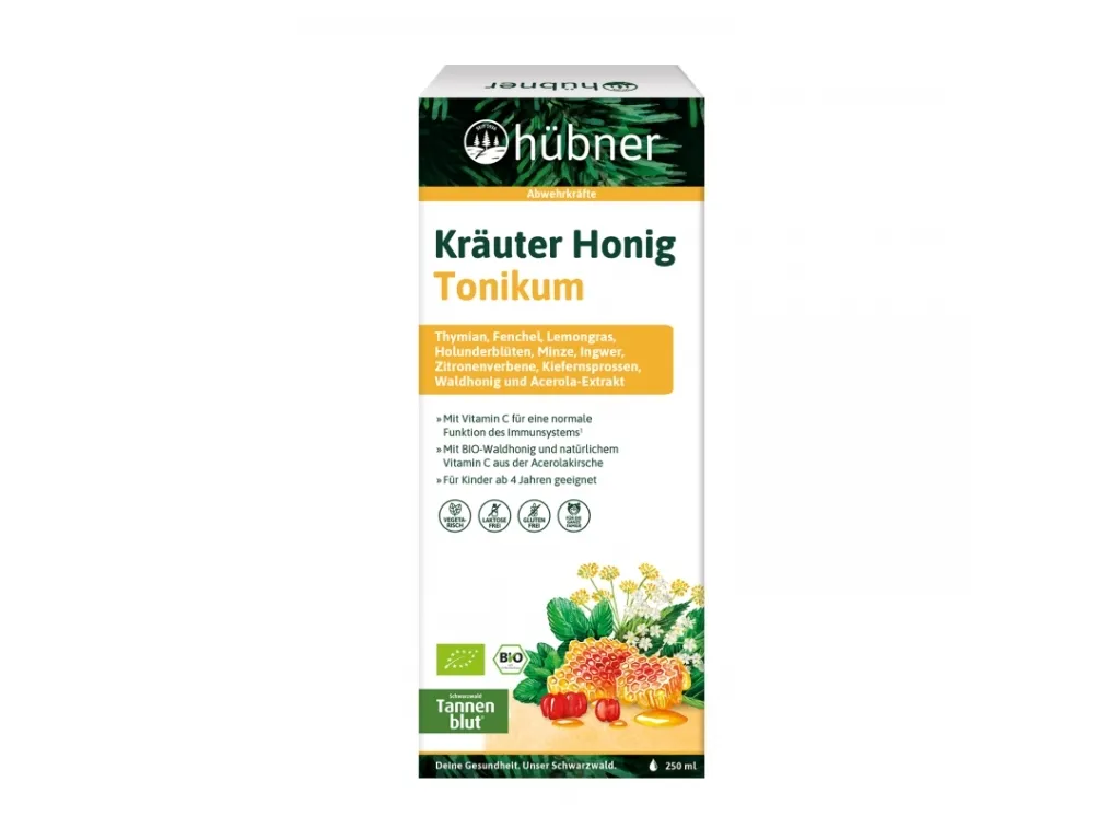 hübner® Kräuter Honig Tonikum in Bio-Qualität mit BIO Waldhonig und natürlichem Vitamin C, das zu einer normalen Funktion des Immunsystems beiträgt. Alter Name: Tannenblut® BIO Kräuter-Tonikum mit Honig.