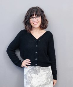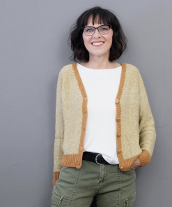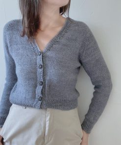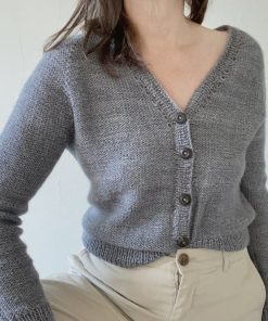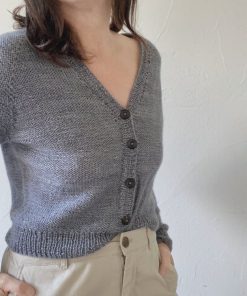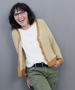 Die Jacke Canelle hat einen hübschen V-Ausschnitt mit einem kleinen Lochmuster und wird von oben nach unten mit Raglanzunahmen gestrickt. Passe und Rumpfteil werden in Hin- und Rückreihen, die Ärmel werden in Runden gearbeitet. Die ganze Jacke wird glatt links, die Bündchen im Rippenmuster gestrickt. Die Blenden werden im Rippenmuster angestrickt. Du kannst die Jacke Canelle auch glatt rechts stricken.