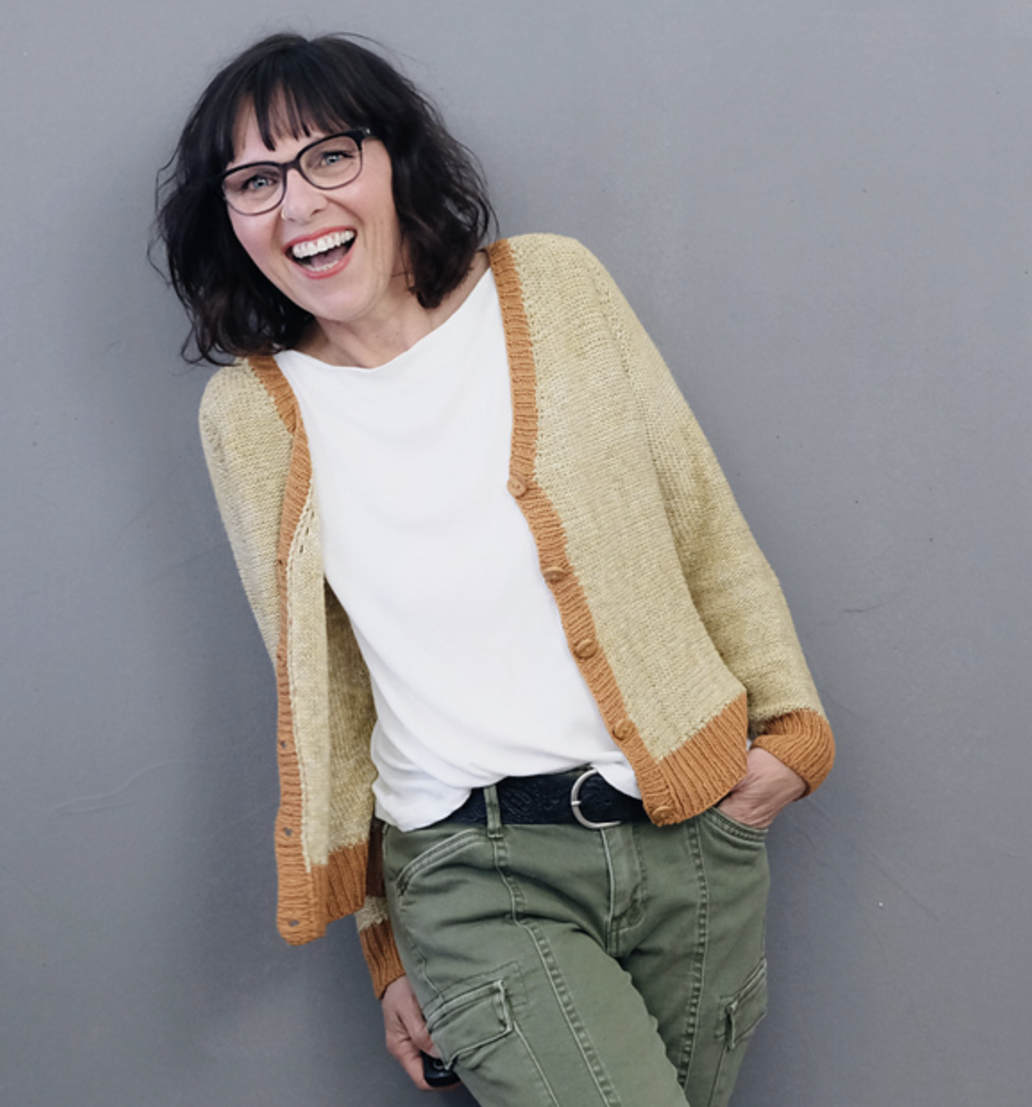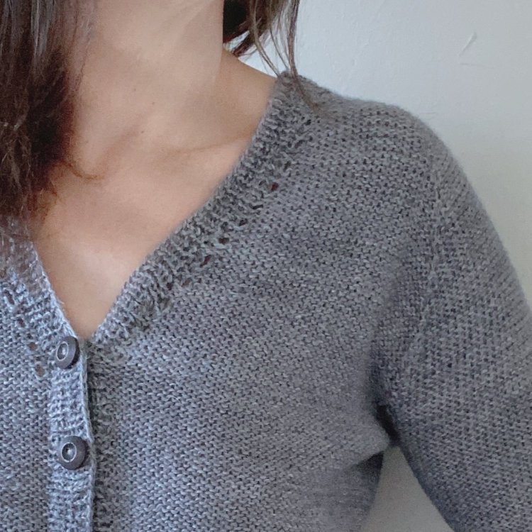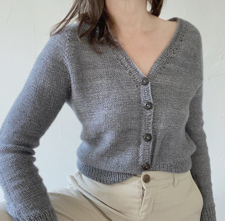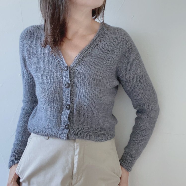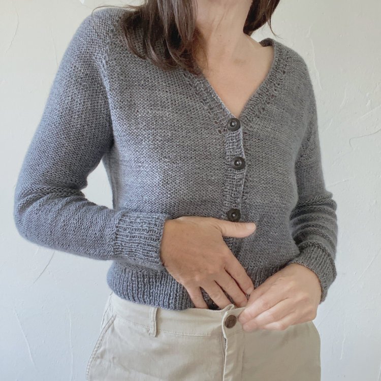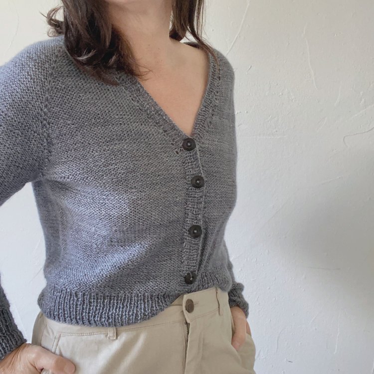 Die Jacke Canelle hat einen hübschen V-Ausschnitt mit einem kleinen Lochmuster und wird von oben nach unten mit Raglanzunahmen gestrickt. Passe und Rumpfteil werden in Hin- und Rückreihen, die Ärmel werden in Runden gearbeitet. Die ganze Jacke wird glatt links, die Bündchen im Rippenmuster gestrickt. Die Blenden werden im Rippenmuster angestrickt. Du kannst die Jacke Canelle auch glatt rechts stricken.