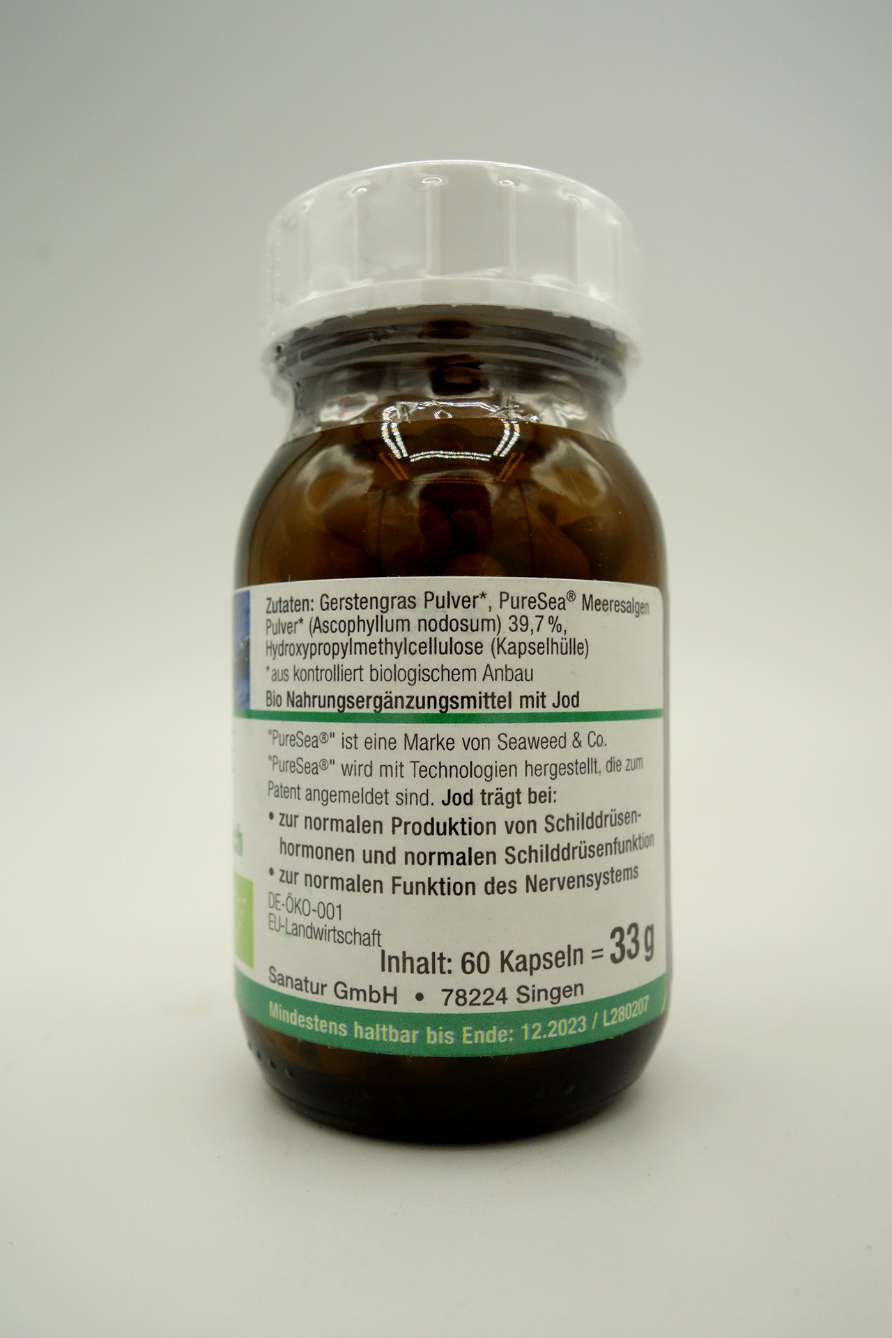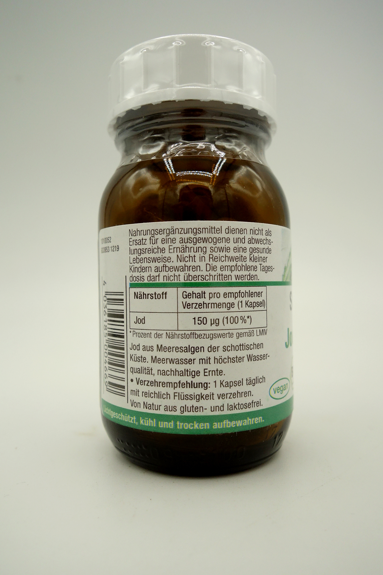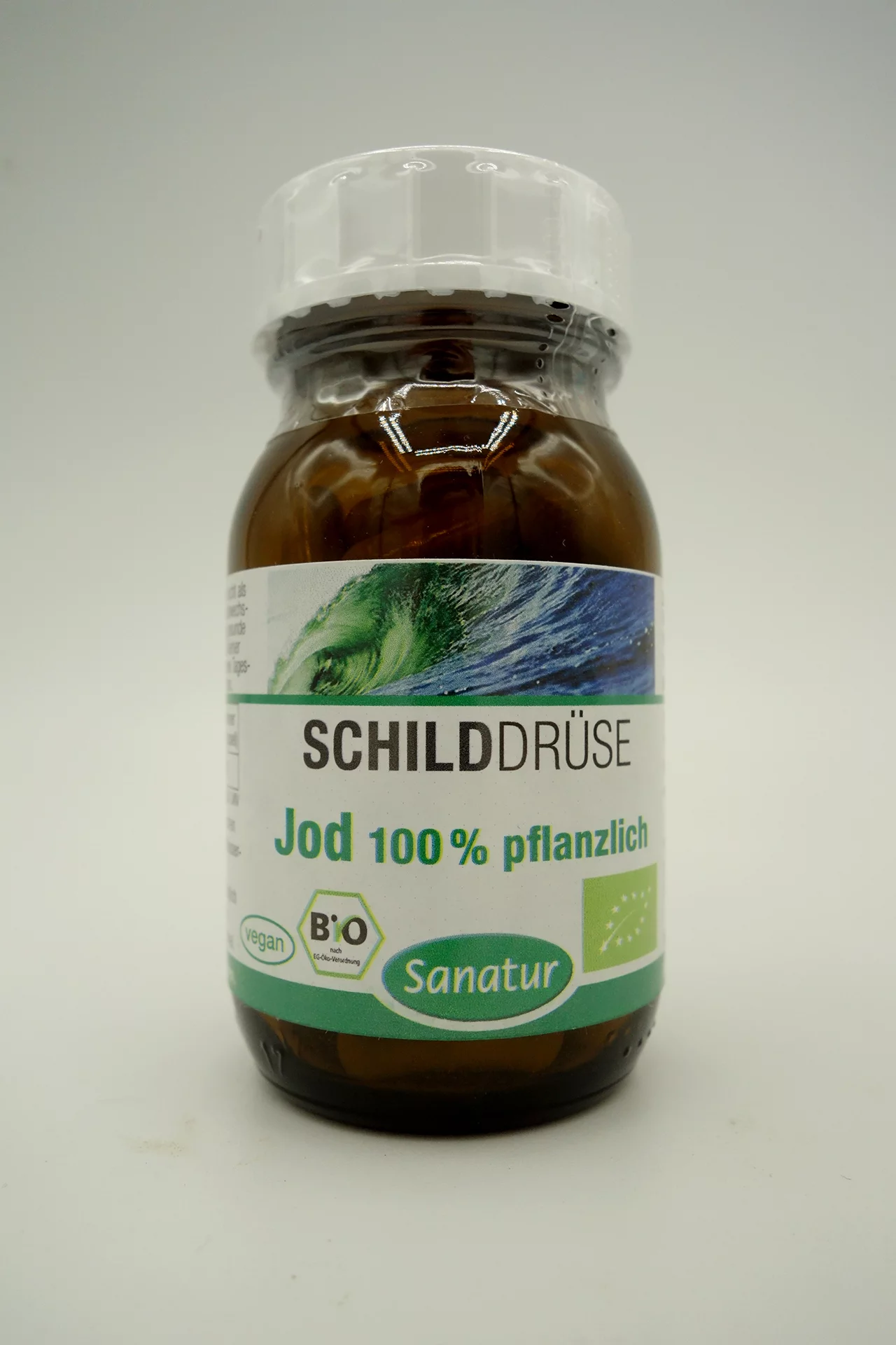 Jod aus Meeresalgen (Ascophyllum nodosum). Jod gehört zu den essentiellen (lebensnotwendigen) Spurenelementen. Es ist vor allem bei der Bildung von Schilddrüsenhormonen wichtig. Der tägliche Jodbedarf bei Erwachsenen liegt bei ca. 150 µg Jod. Für Sanatur wird ausschließlich eine speziell entwickelte Mischung ausgesuchter Meeresalgen verwendet, die unter dem Namen PureSea® bekannt ist. Jod 100% pflanzlich ist ein Naturprodukt. Deshalb können Farbe, Geschmack und Analysewerte geringfügig variieren.