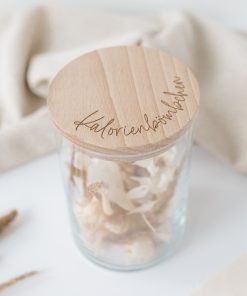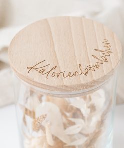 Ihr möchtet gerne ein paar Kleinigkeiten hübsch und vor allem mal anders verpacken? Dann ist dieses gravierte Vorratsglas mit Holzdeckel und dem gravierten Spruch “Kalorienbömbchen” genau die richtige Wahl! Die Gläser eignen sich hervorragend zum Verpacken von Gutscheinen, Süßigkeiten, Knabbereien oder andere Kleinigkeiten. Ein perfektes Geschenk zum Geburtstag, Weihnachten oder einfach als Mitbringsel!