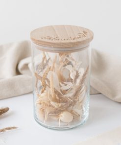 Vorratsglas mit graviertem Deckel | 10 cm Durchmesser | 16 cm oder 20,8 cm Höhe | 880 ml oder 1210 ml | Holzdeckel | Trockenblumen nach Wahl | ohne Dekoration