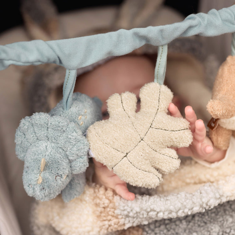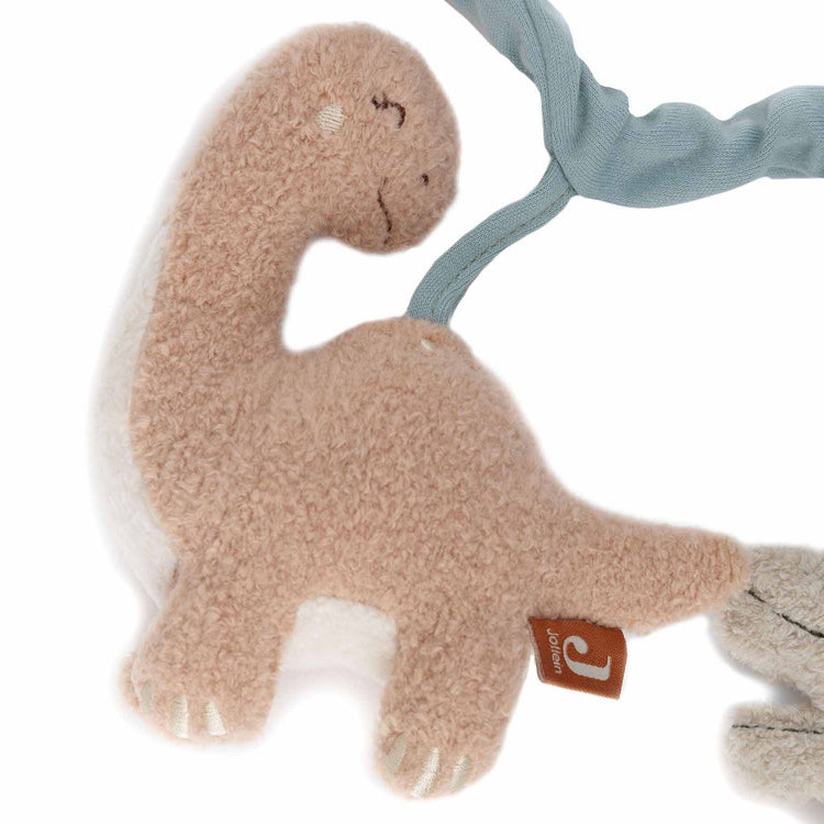 Diese Kinderwagenkette mit den niedlichen Dinos ist ein wahrer Hingucker. An der Kette hängen zwei Dinos & ein Blatt in den Farben Sea Green, Olive Green, Oatmeal und Biscuit.