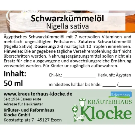 Klocke Schwarzkümmel-Öl (Nigella sativa) – Ägyptisches Schwarzkümmelöl mit 7 wertvollen Vitaminen und mehrfach ungesättigten Fettsäuren. Für unser Schwarzkümmel-Öl wird ausschließlich hochwertiges Öl aus den sonnereichen Gebieten des nahen Ostens verwendet. So erhält Schwarzkümmel-Öl einen hohen Anteil an ungesättigten Fettsäuren, die für den Fettstoffwechsel unentbehrlich sind. Über 50 % der enthaltenen Fettsäuren sind mehrfach ungesättigte Fettsäuren, von allem Linolsäuren. Für den Stoffwechsel wesentliche Vitamine erhöhen den ernährungsphysiologischen Wert des Öls.