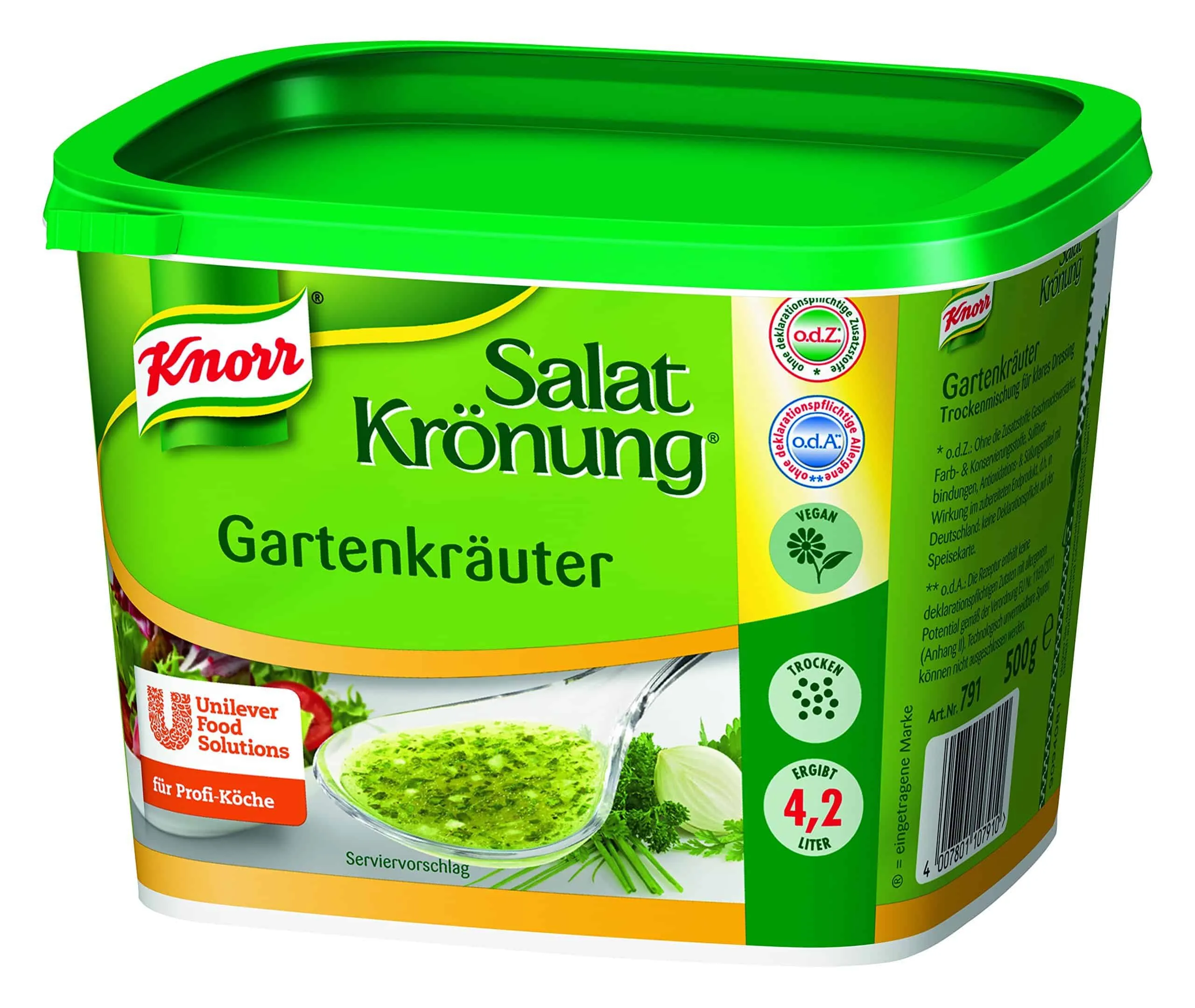 Zutaten: Maltodextrin, jodiertes Speisesalz, Zucker, modifizierte Stärke, Säureregulator (Natriumdiacetat), Säuerungsmittel (Citronensäure), 2,5% Petersilie, 2,5% Schnittlauch, Maiskeimöl, Knoblauchpulver, Spinatpulver, 1,5% Zwiebeln, Verdickungsmittel (Xanthan), Hefeextrakt, Stärke, Gewürze (Pfeffer, Curcuma), 0,4% Kerbel, Speisesalz, Aromen. ¹o.d.A.: