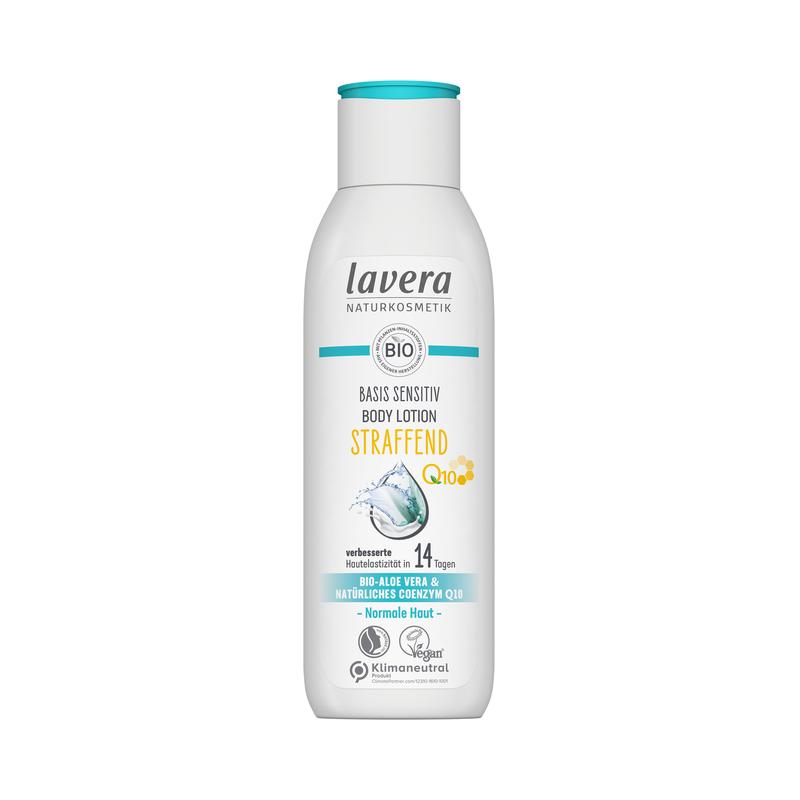 Die Basis Sensitiv Body Lotion Straffend mit Bio-Aloe Vera & natürlichem Coenzym Q10 verbessert die Hautelastizität in 14 Tagen.
