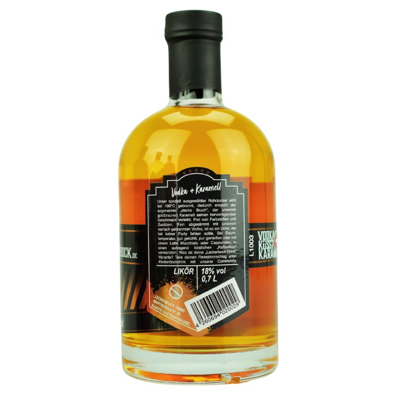 der Leckerbock Karamelllikör ist frei von Farbstoffen und Zusatzstoffen, was ihn zu einer reinen Genussquelle macht. Verfeinert mit unserem vierfach gebrannten Vodka, bietet er ein Geschmackserlebnis, das bei keiner Party fehlen sollte.