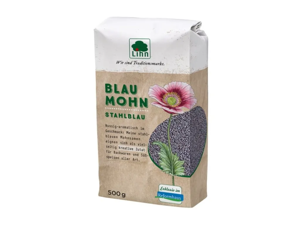 Die kleinen Mohnsamen werden aus den reifen Kapseln der Mohnpflanze gewonnen. Dieser Mohn zeichnet sich durch seine gleichmäßige stahlblaue Färbung und den nussigaromatischen Geschmack aus. Er ist als ganzer Samen und auch gemahlen erhältlich. Wie alle Ölsaaten ist der Mohn reich an den wertvollen mehrfach ungesättigten Fettsäuren. Er zeichnet sich durch einen hohen Eiweißgehalt aus und enthält reichlich Mineralstoffe und Ballaststoffe. Mohn lässt sich sowohl süß als auch pikant zubereiten. Die bekannteste Verwendung ist die als Füllung im Mohnstrudel. Auch in Süßspeisen und Kuchen sowie auf Brötchen, Brot und Kleingebäck setzt der würzige Mohn interessante geschmackliche Akzente.