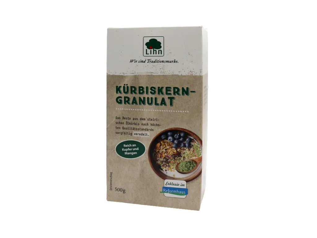 Lihn Kürbiskerngranulat aus schalenlos gewachsenen Kürbiskernen ist fein-nussig im Geschmack. Durch Rösten oder Backen entfaltet es sein vollstes Aroma.