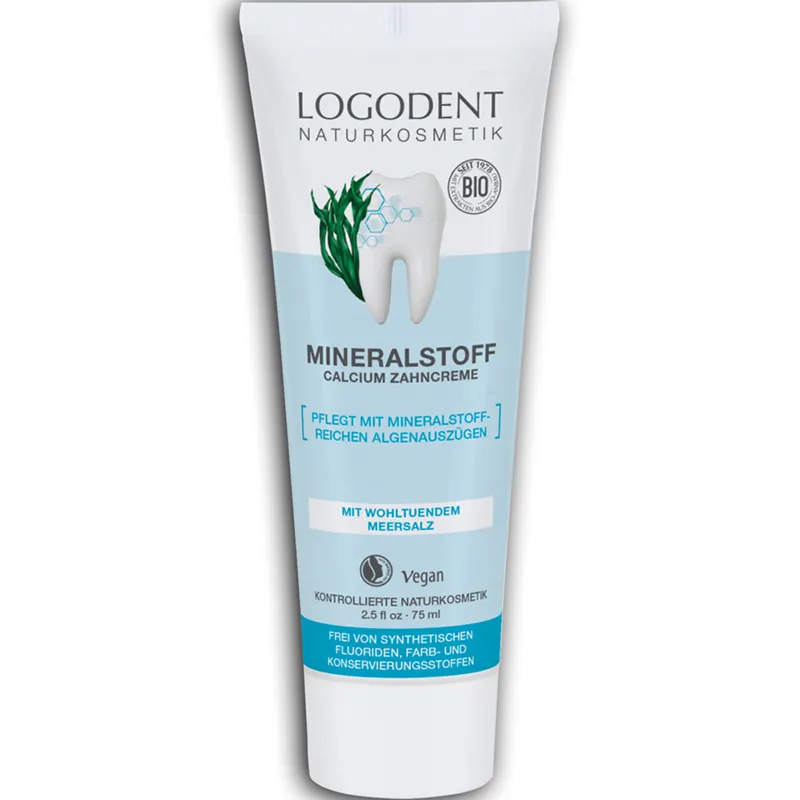 Logodent Mineralstoff Calcium ist die besonders sanfte Zahncreme mit mild frischem natürlichem Aroma. Sie ist dank einer natürlichen Wirkstoffkombination aus Meersalz und mineralstoffreichen Algenauszügen zur schonenden Reinigung und Pflege von Zähnen und der Gesunderhaltung des Zahnfleisches geschaffen.