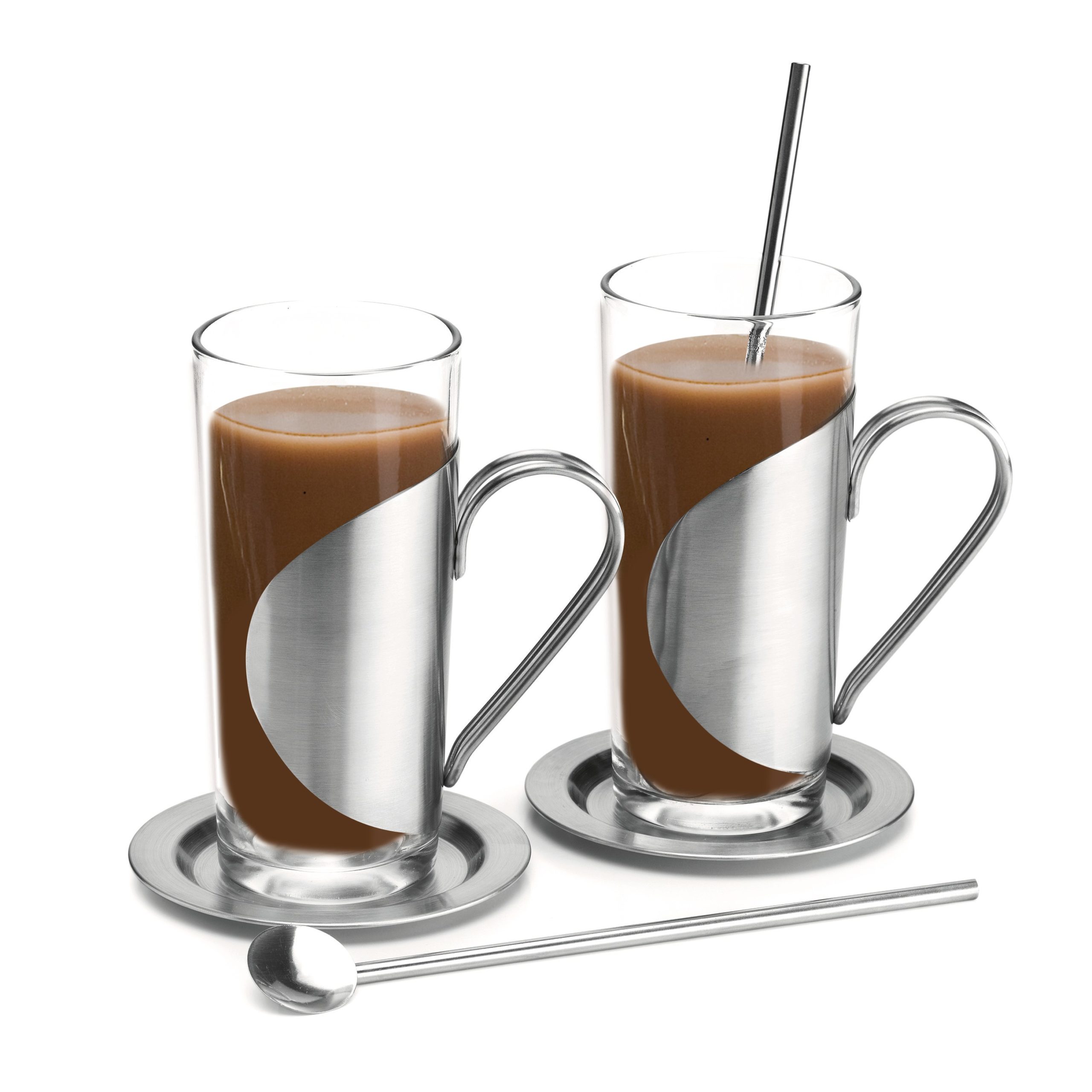 Set besteht aus: 2 Schokoladengläser mit Untersetzern, 2 Trinkhalmlöffel, 2 Tütchen Trinkschokolade, 2 Schokotäfelchen, 1 Fläschchen Rum und 1 Rezept.