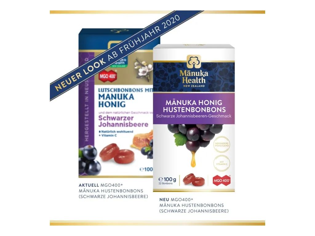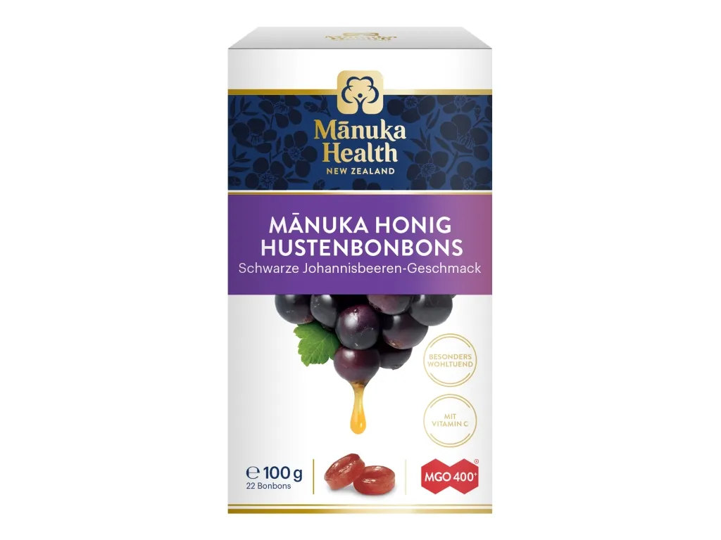 Manuka MGO™ 400+ schwarze Johannisbeere Lutschbonbons mit dem natürlichen Geschmack Schwarzer Johannisbeere.