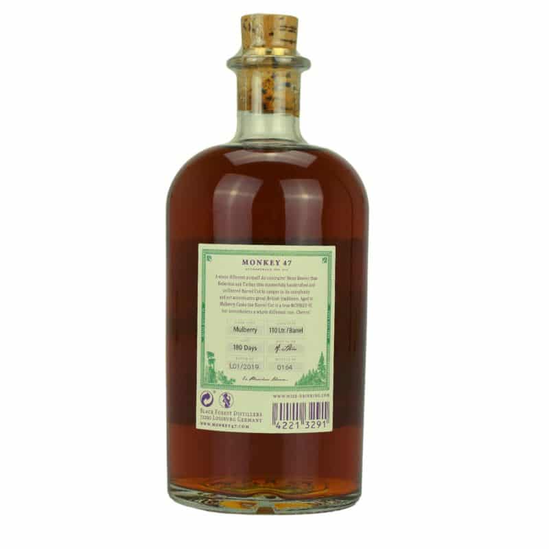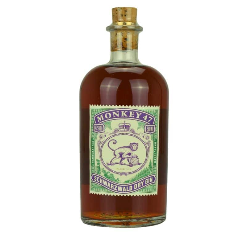 Monkey 47 ist ein Dry Gin, der im Schwarzwald aus dem Wasser einer hauseigenen Quelle hergestellt und in Steingutfässern gelagert wird. Seine Rezeptur geht auf den Briten Montgomery "Monty" Collins zurück, den es 1945 als Angehörigen der Royal Air Force zunächst nach Berlin verschlug, wo er sich für den Wiederaufbau des Berliner Zoos engagierte und die Patenschaft für einen Affen namens Max übernahm. Nach dem Militärdienst ließ sich Collins im Schwarzwald nieder und eröffnete den Landgasthof "Zum wilden Affen". Hier entwickelte er einen Schwarzwälder Gin, dessen Rezeptur seit 2008 die Basis für Monkey 47 Dry Gin bildet. Die Zahl im Produktnamen verweist auf die insgesamt 47 Zutaten, die bei der Herstellung verwendet werden. Neben exotischen Kräutern finden auch lokale Kräuter und Beeren ihren Weg in den Gin. Das überzeugende Resultat ist ein harmonisch komplexer Gin mit einem klaren Wacholderaroma, das von einer frischen Zitrusnote, leichten Pfefferaromen und subtil bitteren Fruchtnoten wunderbar ergänzt wird.