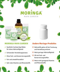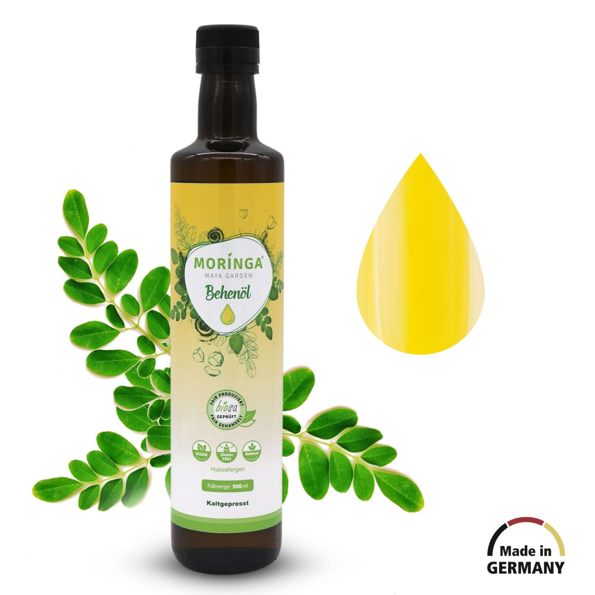 Moringaöl, auch als Behenöl bekannt, gewinnen wir aus dem Samen der Moringa Oleifera in einem schonenden Kaltpressverfahren. Auf diese Weise erhalten wir alle wertvollen Inhaltsstoffe der Pflanze und gewinnen ein Öl von leicht goldener Farbe, weichem nussigen Geschmack, Langlebigkeit und ohne jegliche Zusatz- oder Konservierungsstoffe. Kurz gesagt, ein 100% reines Moringasamenöl.