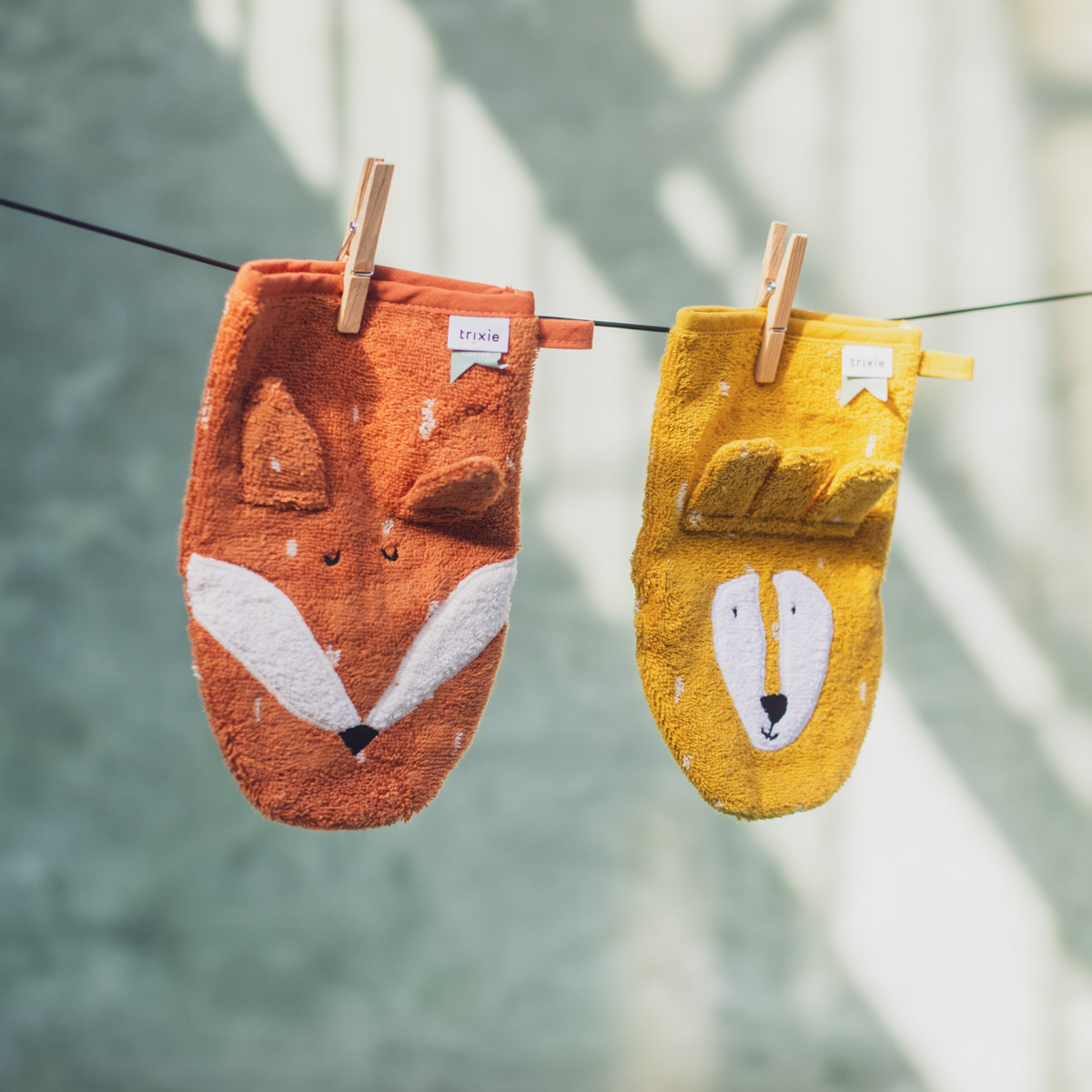 Waschhandschuhe | 2 Stück | Motiv: Mr. Fox (Fuchs) & Mr. Lion (Löwe) | 20 x 14 x 0,5 cm | 100% Bio-Baumwolle | Altersempfehlung ab 0 Monaten | ohne Dekoration