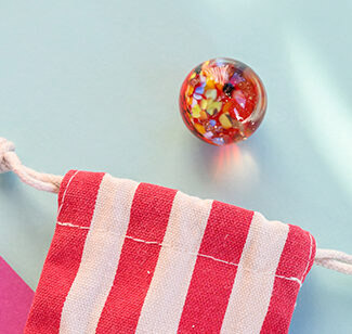 Murmel aus Muranoglas | Farbe Dunkelrot mit Konfetti-Steinchen | 25 mm Durchmesser | hochwertiger Stoffbeutel mit Stickerei “Du bist einzigartig” | ohne Dekoration