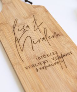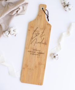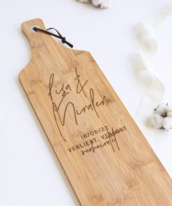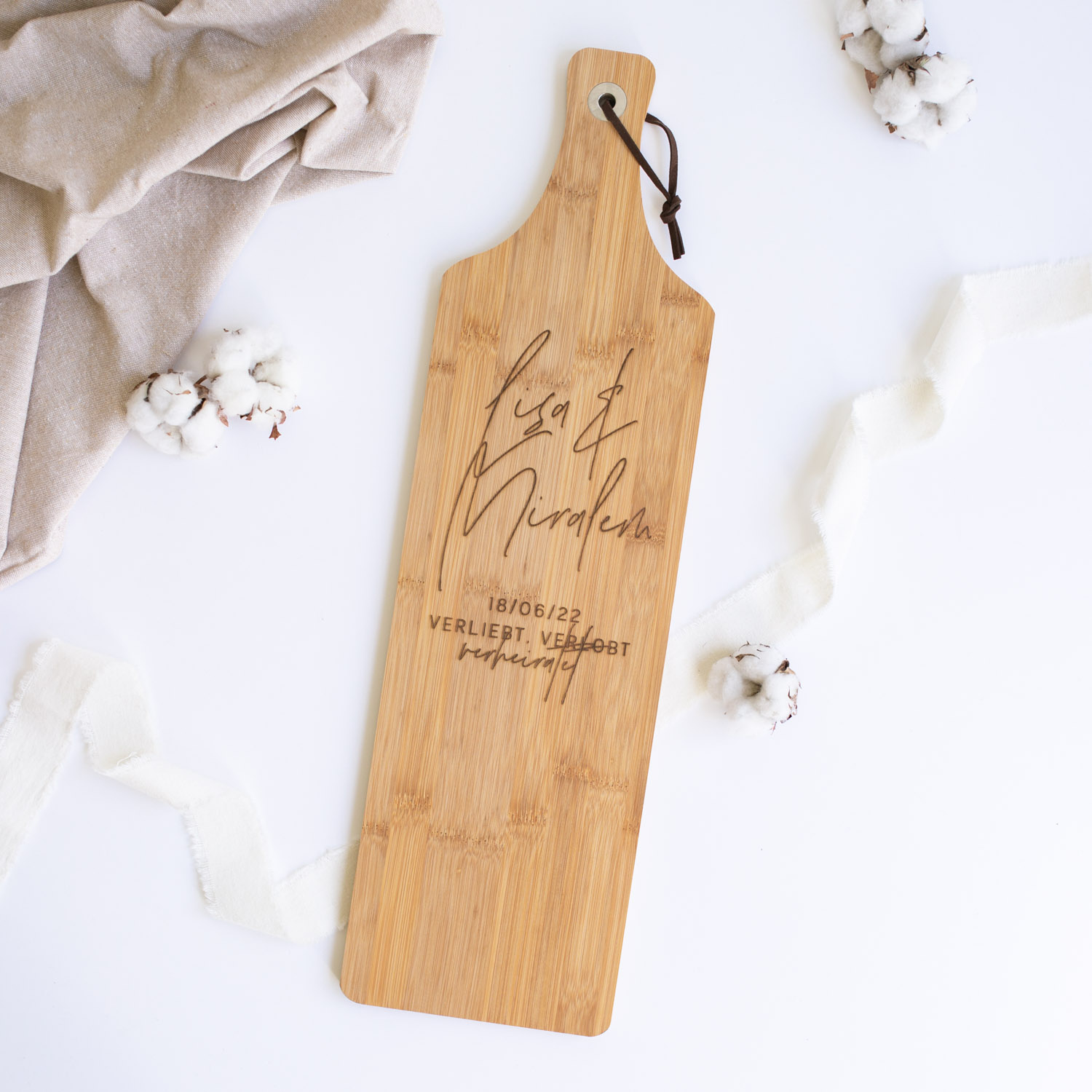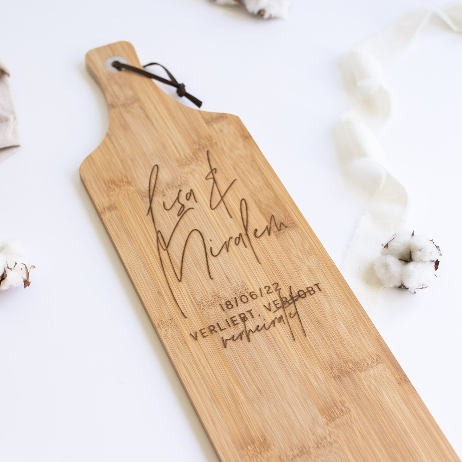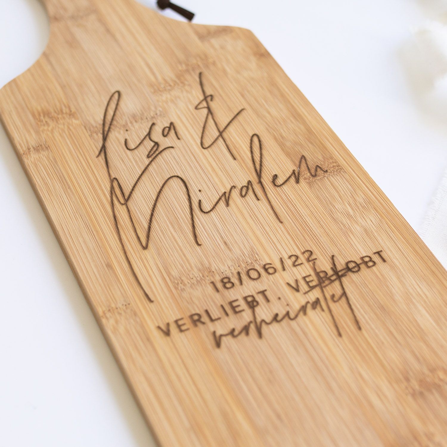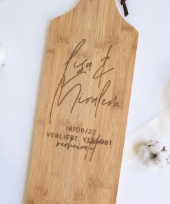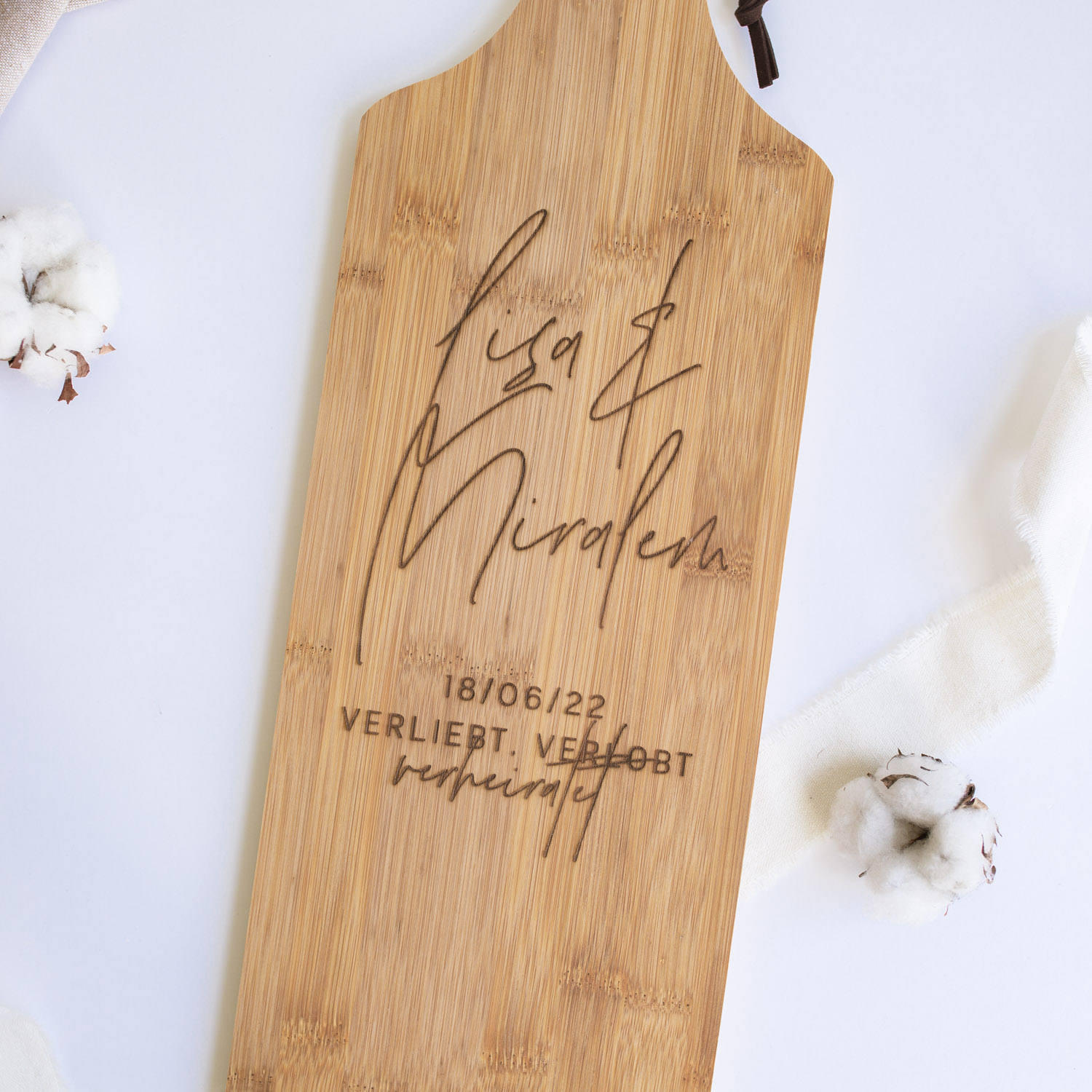 Dieses dekorative Schneidebrett aus Bambus ist mit dem Namen und dem Hochzeitsdatum personalisiert. Das Servierbrett eignet sich perfekt zum Anrichten von Leckereien. Das Schneidebrett ist aus umweltfreundlichem & hochwertigem Bambus gefertigt.