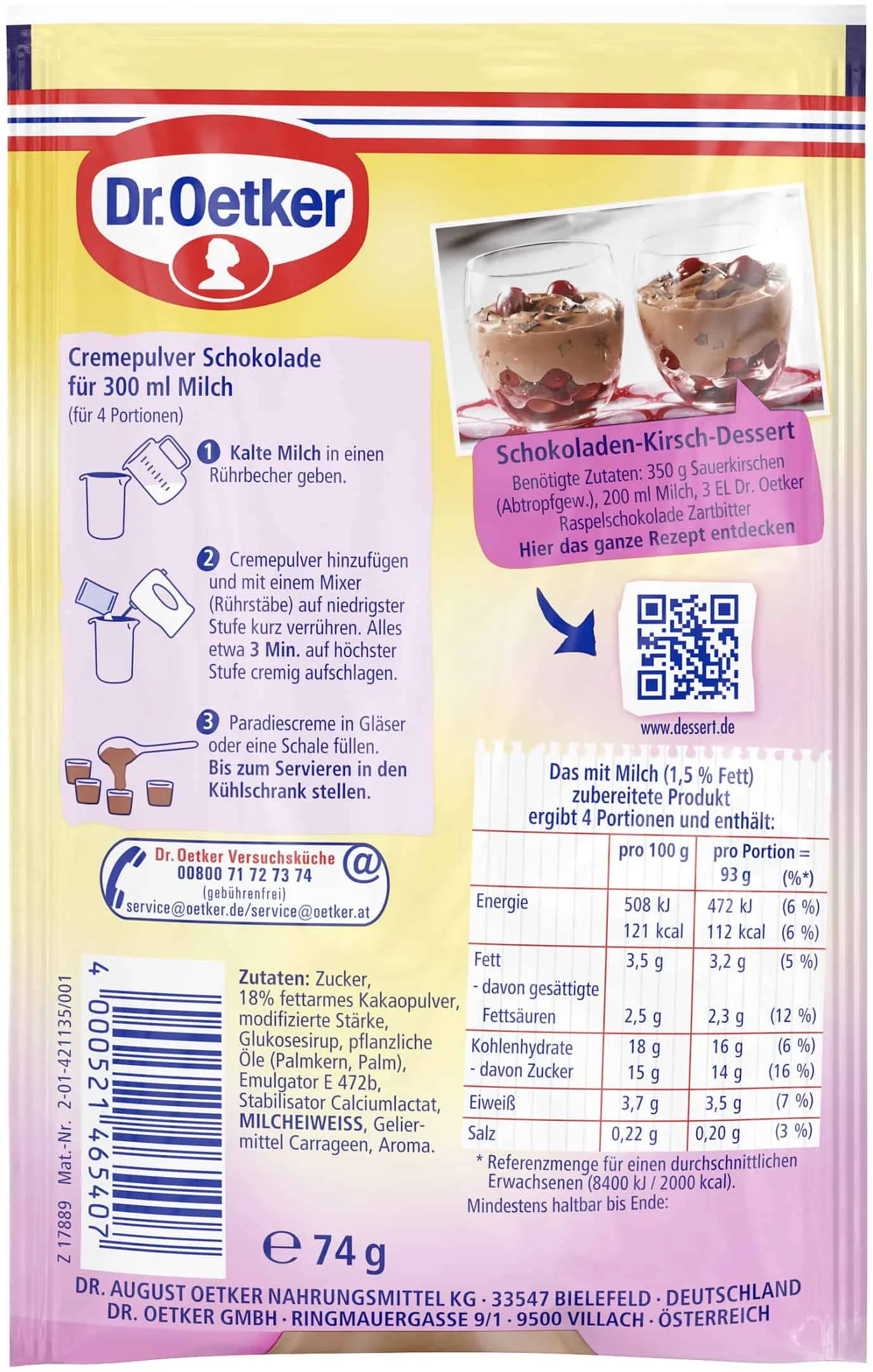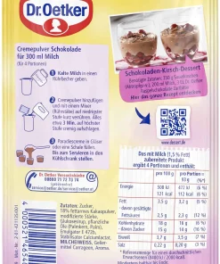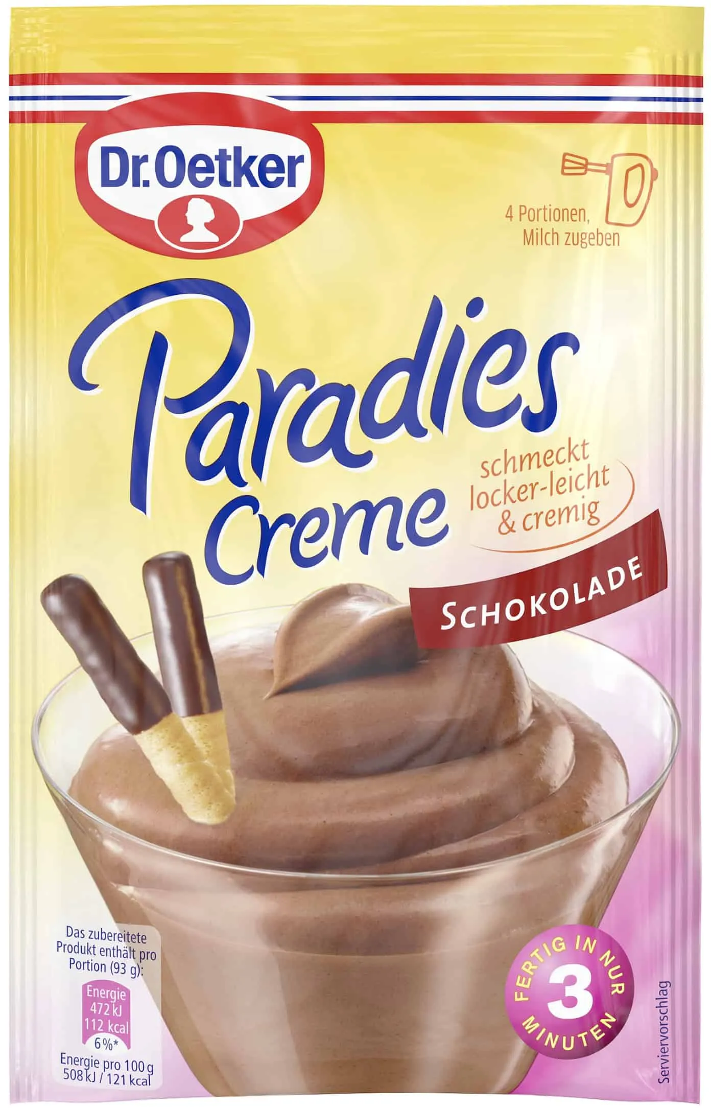 Dr. Oetker Paradies Creme Schokolade ist das perfekte Dessert für die ganze Familie. Mit ihrem köstlichen Geschmack und ihrer lockeren, cremigen Konsistenz verwandelt sie jeden Tag in ein Genusserlebnis. Die Zubereitung ist kinderleicht: Einfach das Cremepulver in kalte Milch geben, drei Minuten lang aufschlagen und schon ist das Dessert fertig zum Verzehr. Ob pur genossen oder mit Sauerkirschen und Raspelschokolade verfeinert – die Dr. Oetker Paradies Creme Schokolade verspricht ein wahres paradiesisches Vergnügen. Bestellen Sie jetzt Dr. Oetker Paradies Creme Schokolade und verwöhnen Sie sich und Ihre Lieben mit diesem herrlichen Dessert.