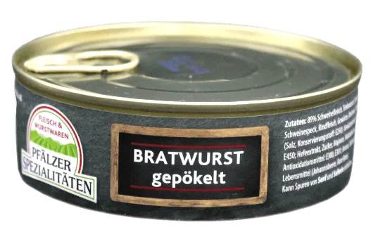 Unsere Bratwurst aus der Konserve besteht aus mittelgrobem Schweinefleischbrät und wird durch erhitzen auf 110°C haltbar gemacht.
