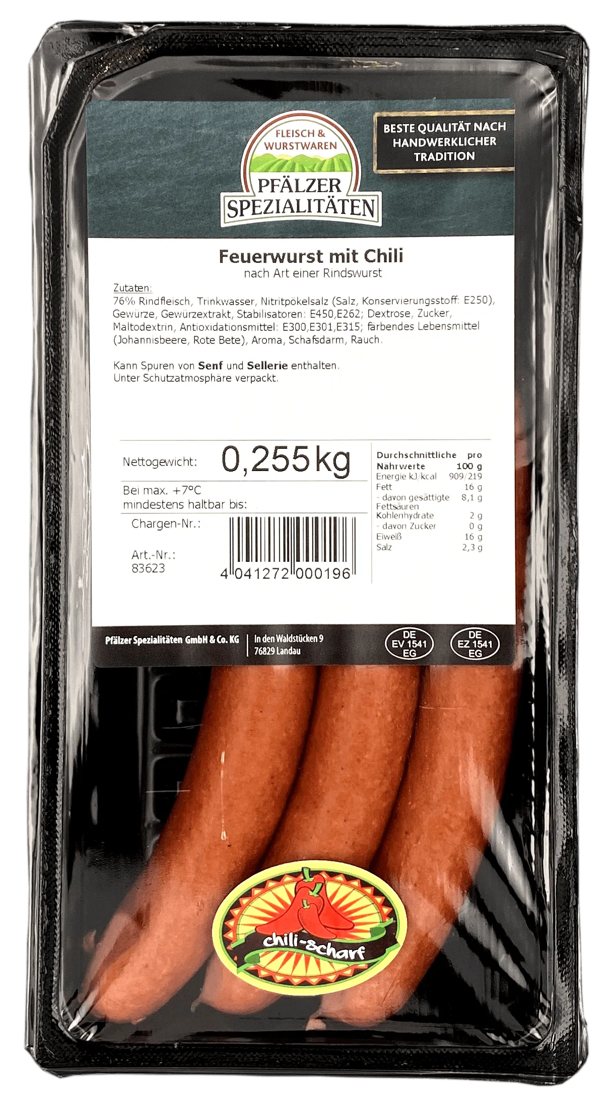 Eine Brühwurst aus Rindfleisch im feinen Schafsdarm mit feurig scharfer Würzung. Zum Warm- und Kaltverzehr geeignet, hervorragend als Currywurst für besonders feuerfeste Gaumen.