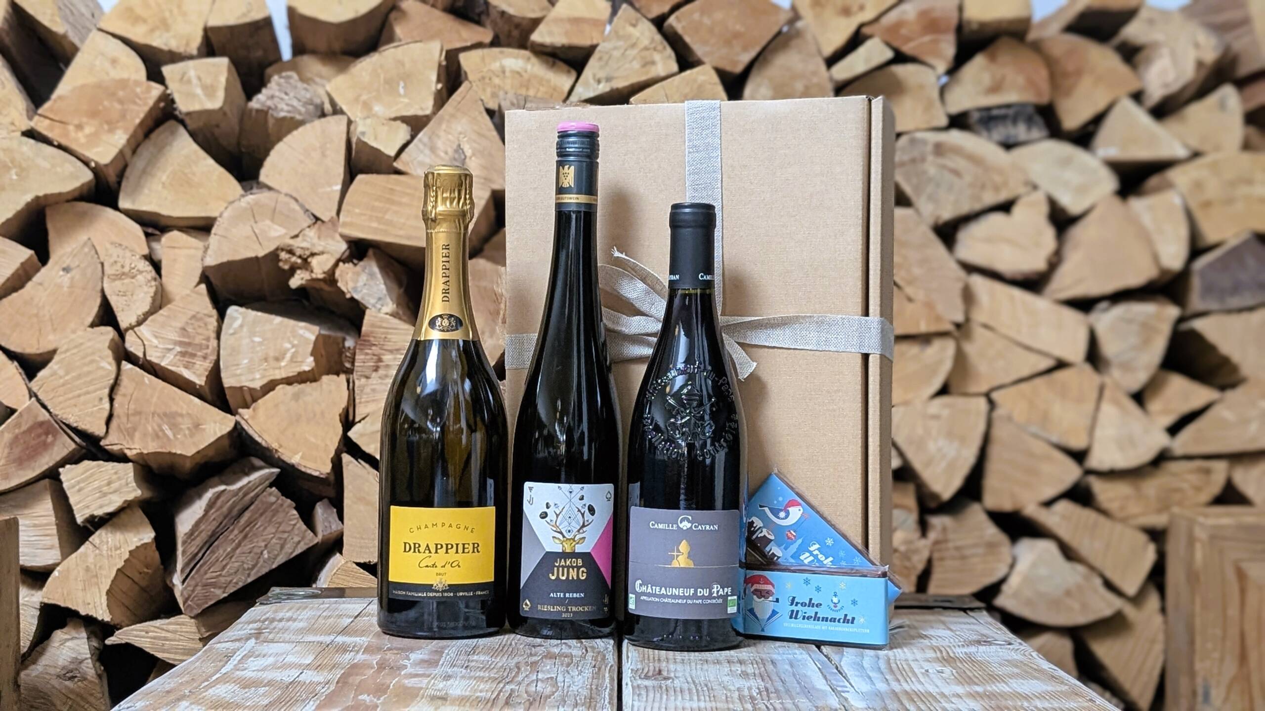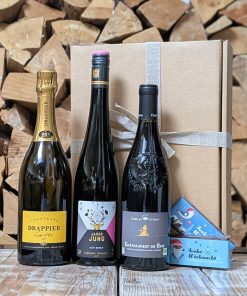 Champagner “Carte d’Or” aus dem Hause Drappier, Riesling “Alte Reben” vom VDP.Weingut Jakob Jung und Châteauneuf du Pape von Camille Cayran und handgeschöpfte Schokolade von Schokovida aus Eppendorf, festlich verpackt in einer Geschenkbox.