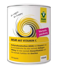 Raab hochreines MSM verbindet organisch gebundenen Schwefel mit natürlichem Vitamin C aus der Acerolakirsche. Organischer Schwefel ist im menschlichen Körper essentieller Bestandteil vieler Strukturen und Moleküle, wie z.B. von Botenstoffen, Proteinen, Haut, Knochen und Knorpeln. Das natürliche Vitamin C aus der Acerolakirsche trägt zu einer normalen Kollagenbildung für eine normale Knorpelfunktion und eine normale Funktion der Knochen bei.