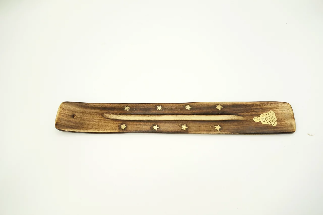 Beschreibung: Mit diesem schönen Räucherstäbchenhalter, können Sie Ihre Lieblings Räucherstäbchen perfekt in Szene setzten. Es handelt sich um einen traditionellen Halter für Räucherstäbchen mit Einlegearbeit aus Metall. Er eignet sich jeweils für ein Räucherstäbchen. Durch seine Form fängt der Halter die abgebrannten Reste in der Schale ab, sodass Sie die Reste dann ganz einfach entsorgen können. Das schöne Massivholz ist naturbelassen und ungefärbt.