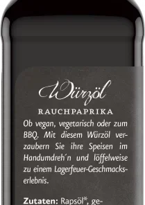 Die köstliche Kombination aus sonnengereiften, geräucherten Paprikaschoten und mühlenfrischem Rapsöl überzeugt nicht nur Fans des klassischen „Smoked Paprika“, sondern alle, die es herzhaft lieben. Die Gewürzmischung enthält neben geräucherter Paprika aromatische Senfsaat, Kurkuma, Knoblauch, Koriander, Liebstöckel und Bockshornklee. Cayennepfeffer gibt dem Würzöl seine milde Schärfe. Zimt, Lorbeerblätter und Kardamom runden den Geschmack ab.