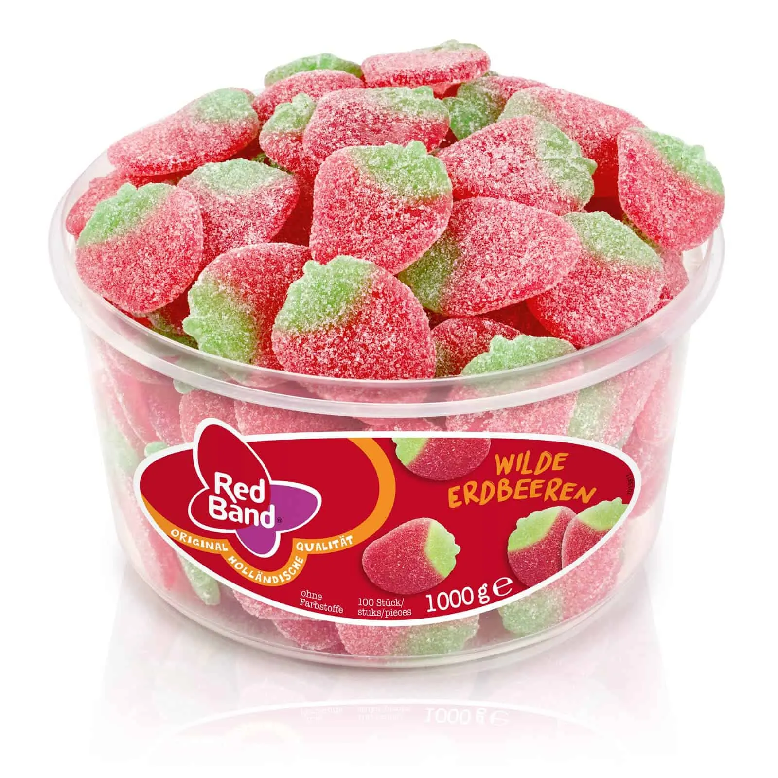 Fruchtig-süß und ganzjährig verfügbar. Red Band Wilde Erdbeeren machen ihrem Vorbild alle Ehre. Das gezuckerten Fruchtgummi-Figuren sind mit ca. 5 cm große prachtvolle Exemplare ihrer Gattung und geben in Form, Farbe und Geschmack ein echtes Musterbeispiel in Sache Erdbeere ab. Bitte nicht als Ganzes in den Mund nehmen.