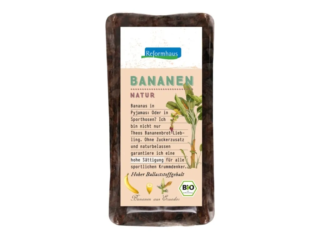 Diese getrockneten Reformhaus Bananen werden hergestellt aus 100% Bio Bananen, die schonend getrocknet und in langen Stücken bzw. Streifen daherkommen. Daher schmeckt diese Leckerei wunderbar süß und fruchtig-aromatisch. Die weichen Streifen vertreiben den kleinen Hunger und stillen den großen Bananen-Appetit. Auf zusätzlichen Zucker, Konservierungsstoffe und auch Schwefel wird bei der Herstellung der veganen Bananenstreifen komplett verzichtet. Ob im Sport oder einfach zwischendurch – die Bananenstreifen machen satt, ohne zu belasten: perfekt!