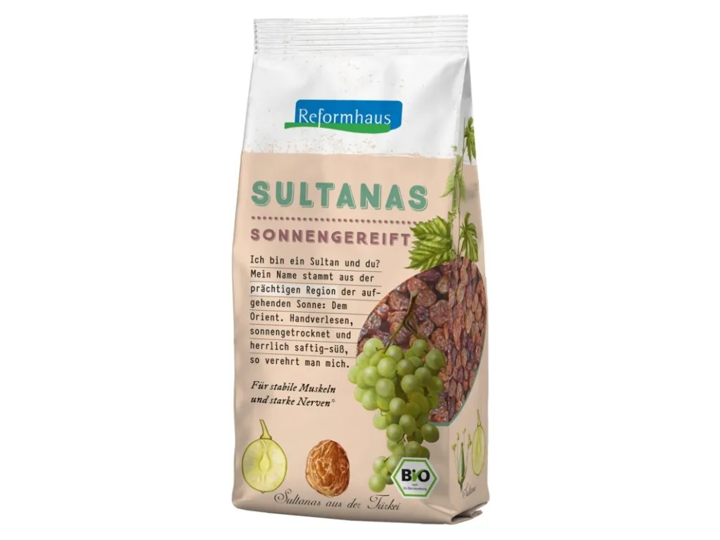 Die sonnengetrockneten Sultanas kommen aus dem neuform Bio-Projekt nahe der türkischen Ägäis-Küste. Sie sind handverlesen und werden nicht nur von Sultans verehrt. Sie verleihen allen Speisen einen orientalischen Touch.