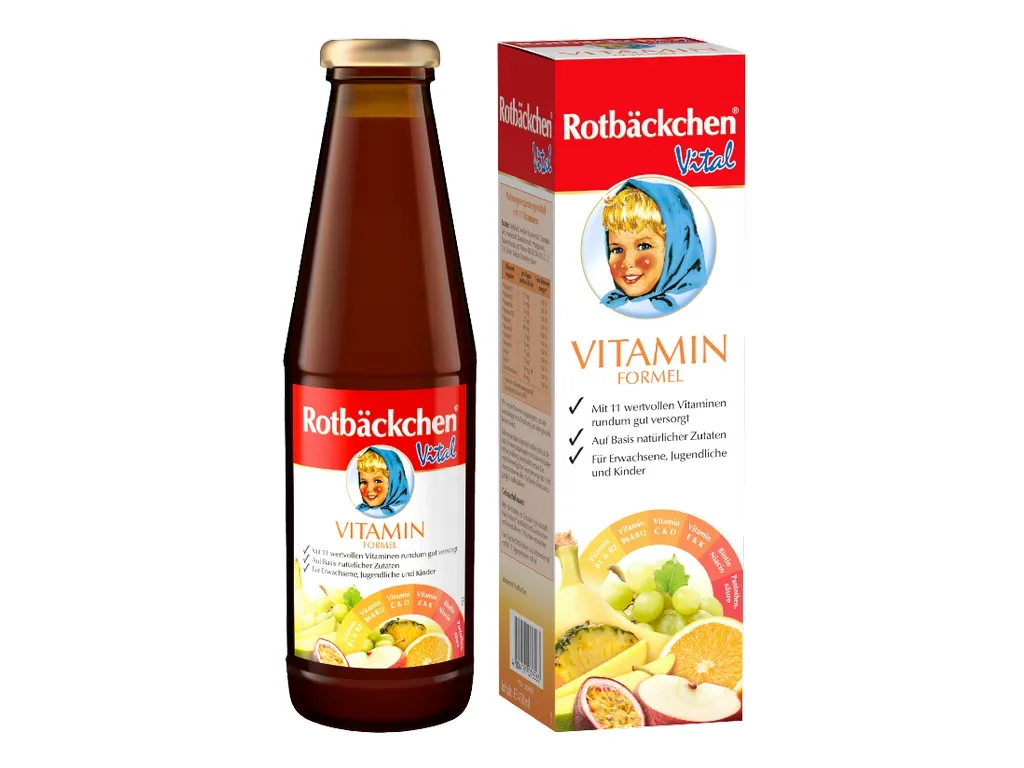 Rotbäckchen Vital Vitamin Formel ist ein Nahrungsergänzungsmittel auf der Basis natürlicher Zutaten. Die umfassende Formel hilft gezielt dabei, den Bedarf an den elf Vitaminen B1, B2, B6, B12, C, D, E, K, Biotin, Niacin und Pantothensäure zu decken.