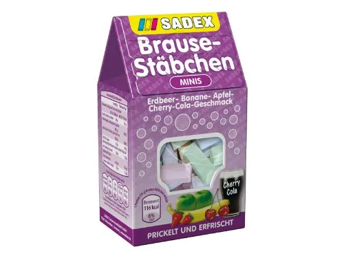 Sadex Brausestäbchen Mini (125g) bieten ein prickelndes Geschmackserlebnis in verschiedenen Fruchtaromen. Diese beliebten, kleinen Brausestäbchen sind frei von künstlichen Aromen und Konservierungsstoffen. Ideal als unterhaltsamer Snack für unterwegs oder zwischendurch, besonders bei Kindern beliebt.