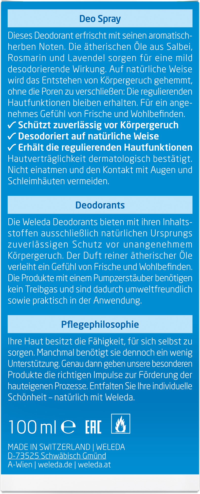 Produktbeschreibung: Es hemmt mit ätherischen Ölen und einem Inhaltsstoff aus Süßholzwurzel (Glycyrrhizinsäure) auf natürliche Weise das Entstehen von Körpergeruch, ohne die regulierenden Hautfunktionen zu beeinträchtigen und verschließt dabei nicht die Hautporen. Das Weleda Salbei Deo Spray ist in einem Pumpzerstäuber ohne Treibgas erhältlich: Einfach in der Anwendung, nachfüllbar und umweltfreundlich. Erfrischung mit Salbei. Das Salbei Deo Spray hemmt mit ätherischen Ölen und einem Auszug aus der Süssholzwurzel das Entstehen von Körpergeruch auf natürliche Weise.