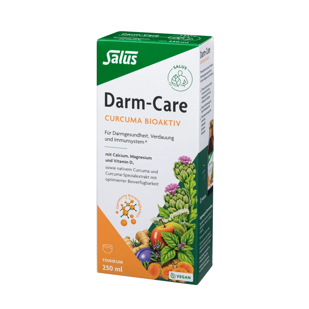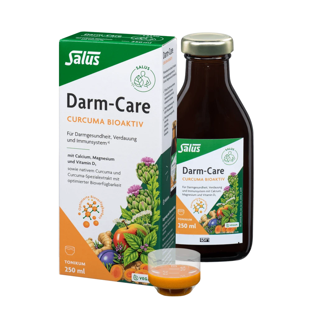 mit dem Darm-Care Curcuma Bioaktiv Tonikum. Dieses kraftvolle Tonikum ist reich an essentiellen Mineralstoffen wie Calcium und Magnesium sowie Vitamin D3, die zusammenarbeiten, um die normale Funktion von Verdauungsenzymen zu unterstützen und die Muskelfunktion zu erhalten. Ideal für die tägliche Gesundheitspflege und das Wohlbefinden Ihres Darms!