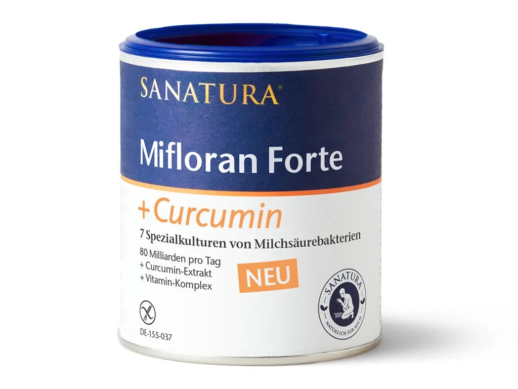 Eine Kombination aus sieben unterschiedlichen Stämmen von Milchsäurebakterien in einer Dosierung von 80 Milliarden pro Tagesportion, zusätzlich Curcumin-Extrakt und einen Vitamin-Komplex mit Biotin und Niacin. Die in Mifloran Forte + Curcumin enthaltenen Milchsäurebakterien sind von Natur aus magensäure- und gallensafttolerant und erreichen daher in aktiver Form den Dickdarm.