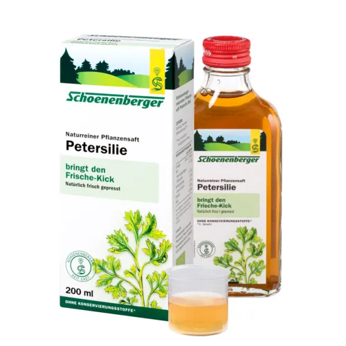 Schoenenberger naturreiner Heilpflanzensaft Petersilie – dezent würzig. Der reine Press-Saft aus frischem Petersilienkraut aus kontrolliert biologischem Anbau.
