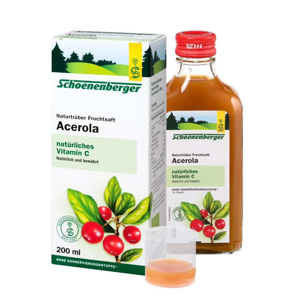 Schoenenberger naturtrüber Acerola Saft mit viel natürlichem Vitamin C. Die Acerola-Kirsche zählt zu den Vitamin C-reichsten Früchten der Welt, ihr Gehalt liegt ungefähr 30-mal höher als bei der Zitrone.