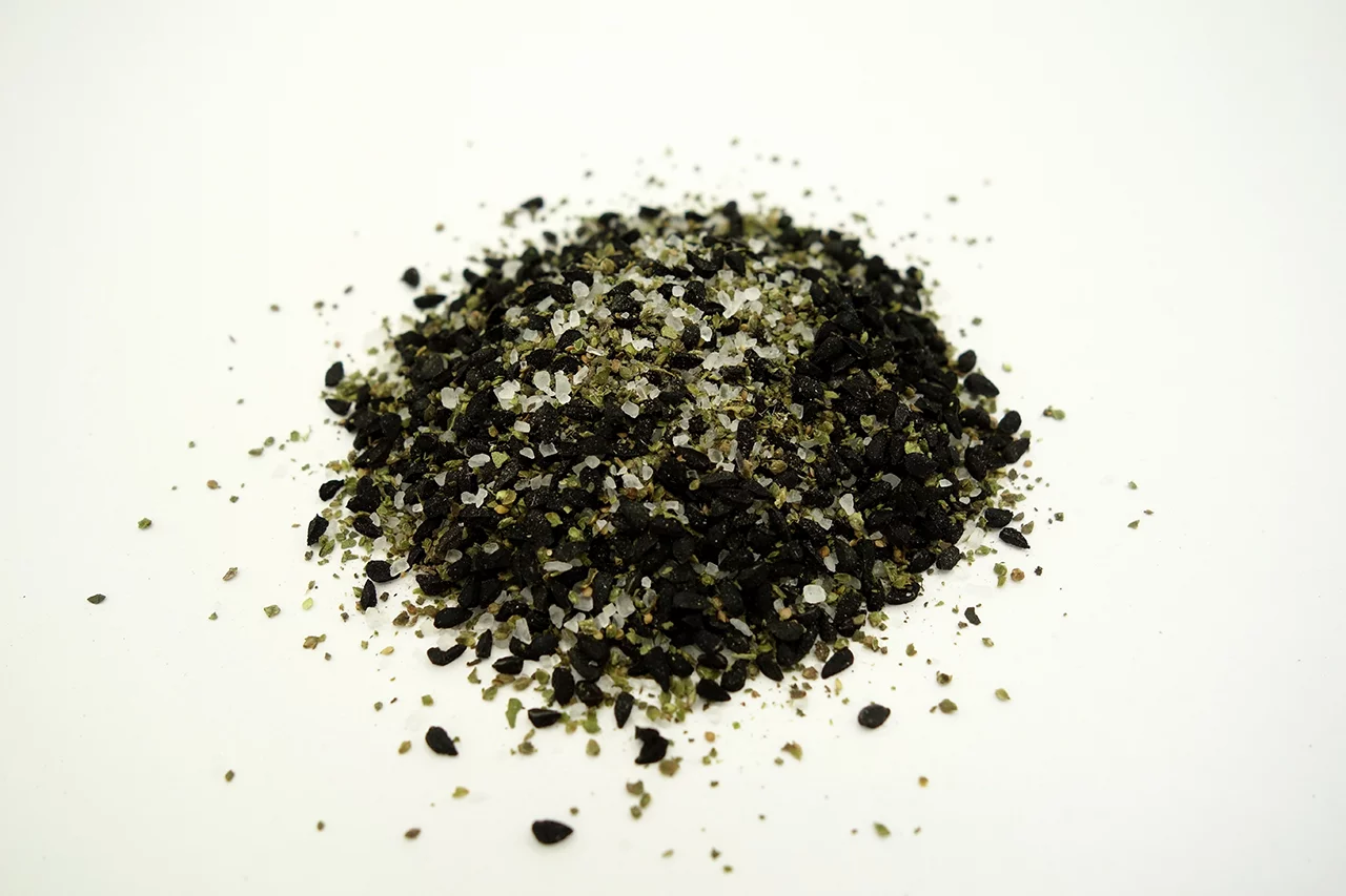 Grob – nur für die Salzmühle, erst bei Bedarf frisch mahlen! Zutaten: Ursteinsalz (40%), Schwarzkümmel (kbA), Brennnesselsamen (kb-wild). Tip: Mischen z.B. mit Basilikum, Thymian oder Rosmarin.