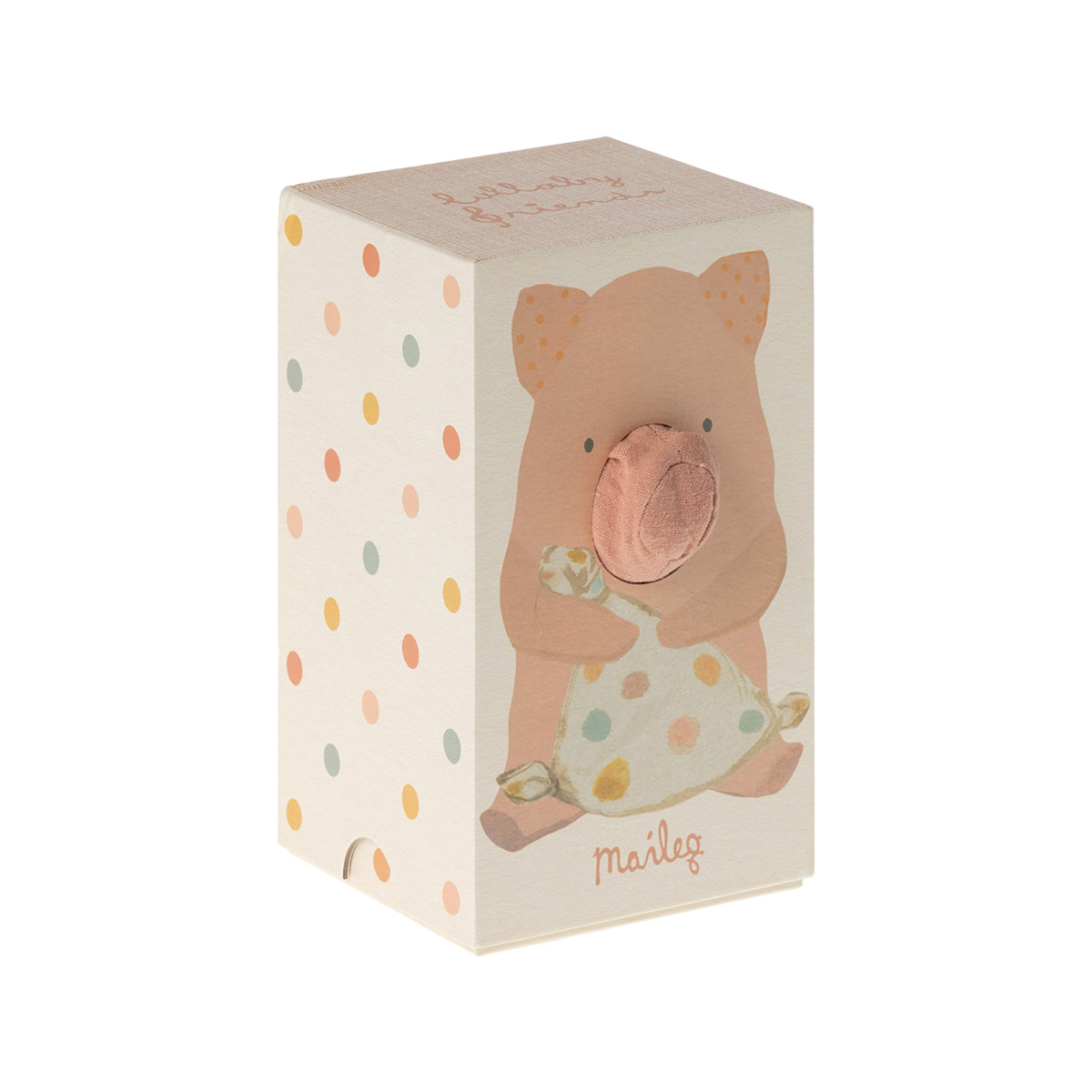 Dieses süße Schweinchen spielt die beruhigende Melodie Mozart’s, wenn du an seinem Schwanz ziehst. Babys und Kleinkinder können mit ihm kuscheln und werden so musikalisch in einer angenehmen Lautstärke in den Schlaf begleitet. Die Kombination aus weichem Leinen und den bunten Punkten macht ihn zu einem echten Hingucker. Die Füllung besteht aus recyceltem Polyester und PE Pellets, was dieses Kuscheltier besonders umweltfreundlich macht.