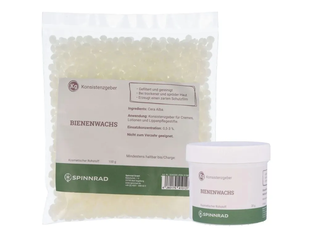 Bienenwachs ist ein Konsistenzgeber für kosmetische Produkte, gleichzeitig schützend bei trockener, spröder Haut. Es hinterlässt einen leichten Film auf der Haut und ist daher gut geeignet für Hand- und Schutzcremes.
