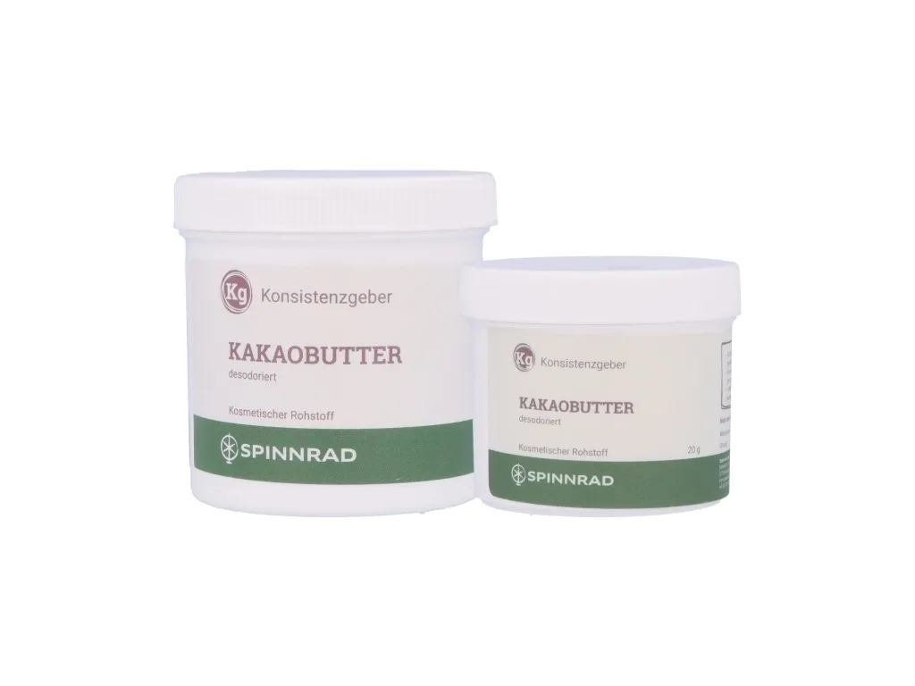 Kakaobutter wird als Konsitenzgeber mit hautpflegenden Eigenschaften verwendet. Seit jeher verbindet man mit ihr eine samtweche Haut. Kakaobutter kann für alle Arten von Emulsionen verwendet werden.