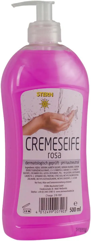 Schlüsselwörter: STERN, Cremeseife, rosa, 500 ml, Pumpflasche, Sanft, Reinigung, Pflege, Hautfreundlich, Angenehmer Duft
