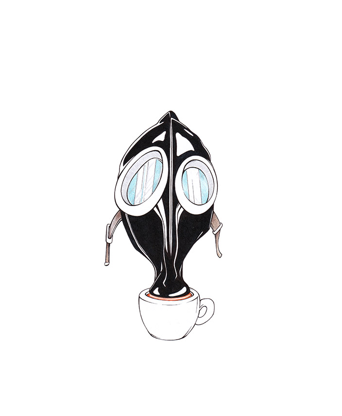 Gasmaske mit Kaffeefilter-Aufsatz. Einfach schön ruhig weiteratmen.