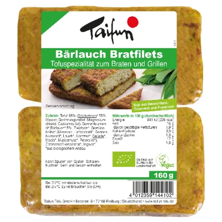 Tofu* 82% (SOJABOHNEN* 55%, Wasser, Gerinnungsmittel: Magnesiumchlorid, Calciumsulfat), Sonnenblumenöl*, Bärlauch* 4,8%, Zwiebeln*, Gemüsebrühe* (Meersalz, Hefeextrakt*, Sonnenblumenöl*, Lauch*, Karotten*, SELLERIE*, Macis*, Muskatnuss*, Petersilie*), Zitronensaftkonzentrat*, Ingwer*.