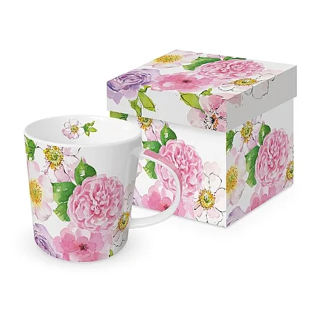 Große, dekorierte Tasse aus Magnesiumporzellan in passender rechteckiger Geschenkdose.