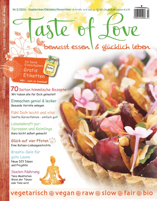 In der Herbstausgabe erhältst du auf 148 Seiten außerdem viele Informationen zum Thema Gesundheit, Einmachen, Seelen-Nahrung und nützliche DIY-Tipps. Wir zeigen dir unter anderem gesunde und leckere Essigkur-Rezepte, und wir stellen dir eine tolle Hang-Künstlerin vor. Außerdem findest du wieder viele von uns getestete Produkte und interessante Bücher aus verschiedenen Bereichen.