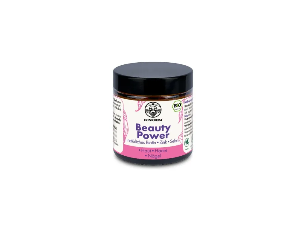 TRINKKOST BEAUTY POWER ist eine Mischung aus pflanzlichen BIO-Vitaminen und BIO-Mineralien, die dich mit Biotin, Zink und Selen versorgt und die natürliche Schönheit von Haut, Haaren und Nägeln unterstützt.
