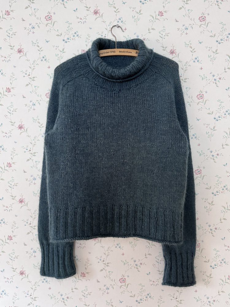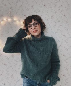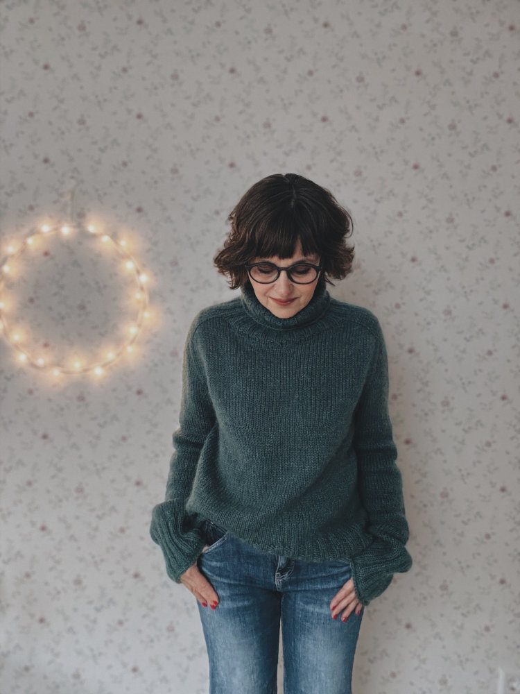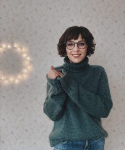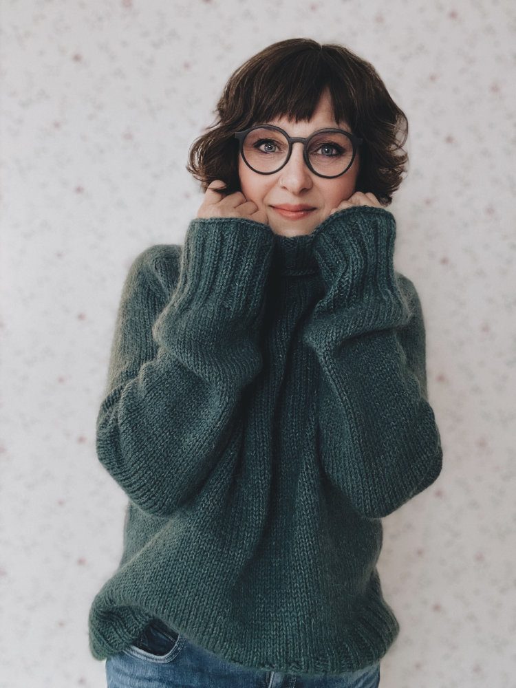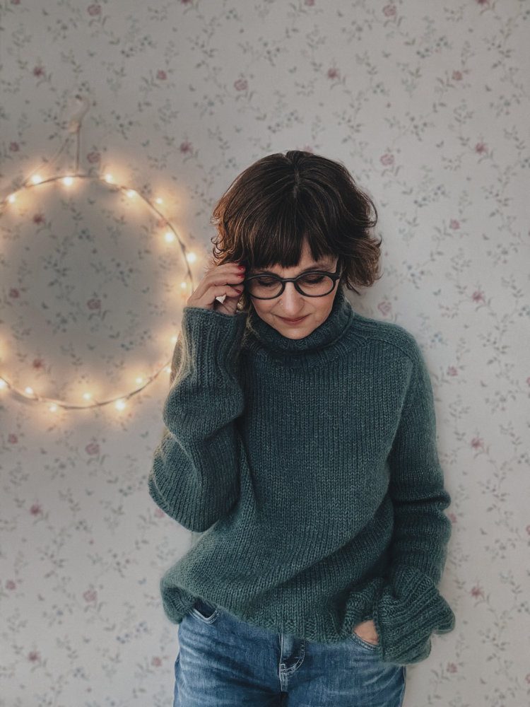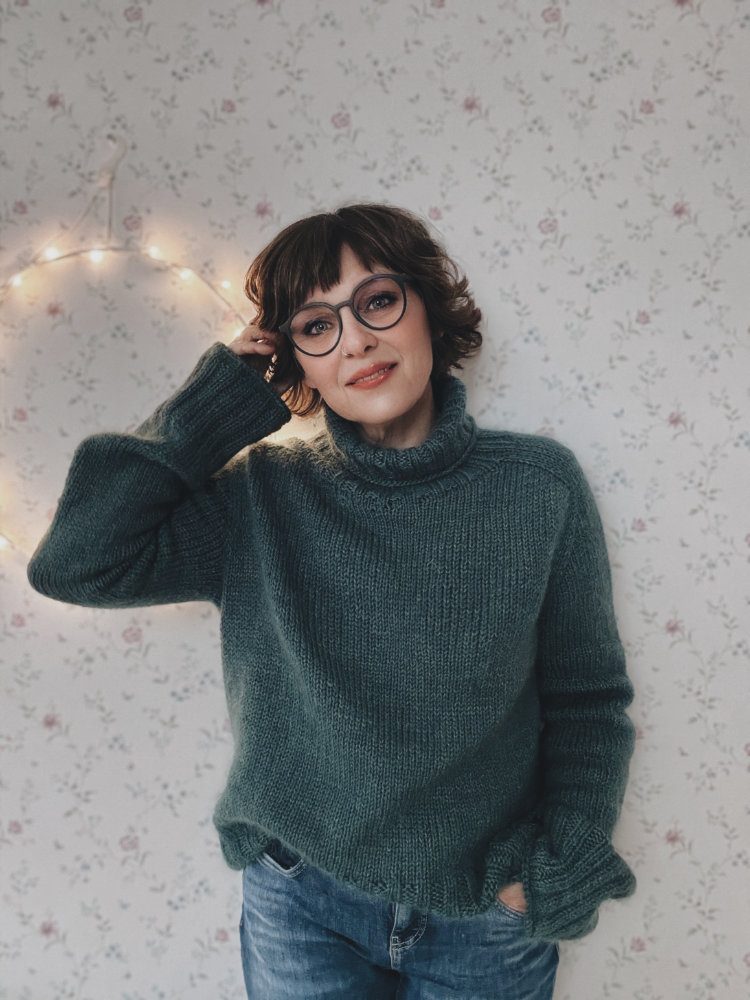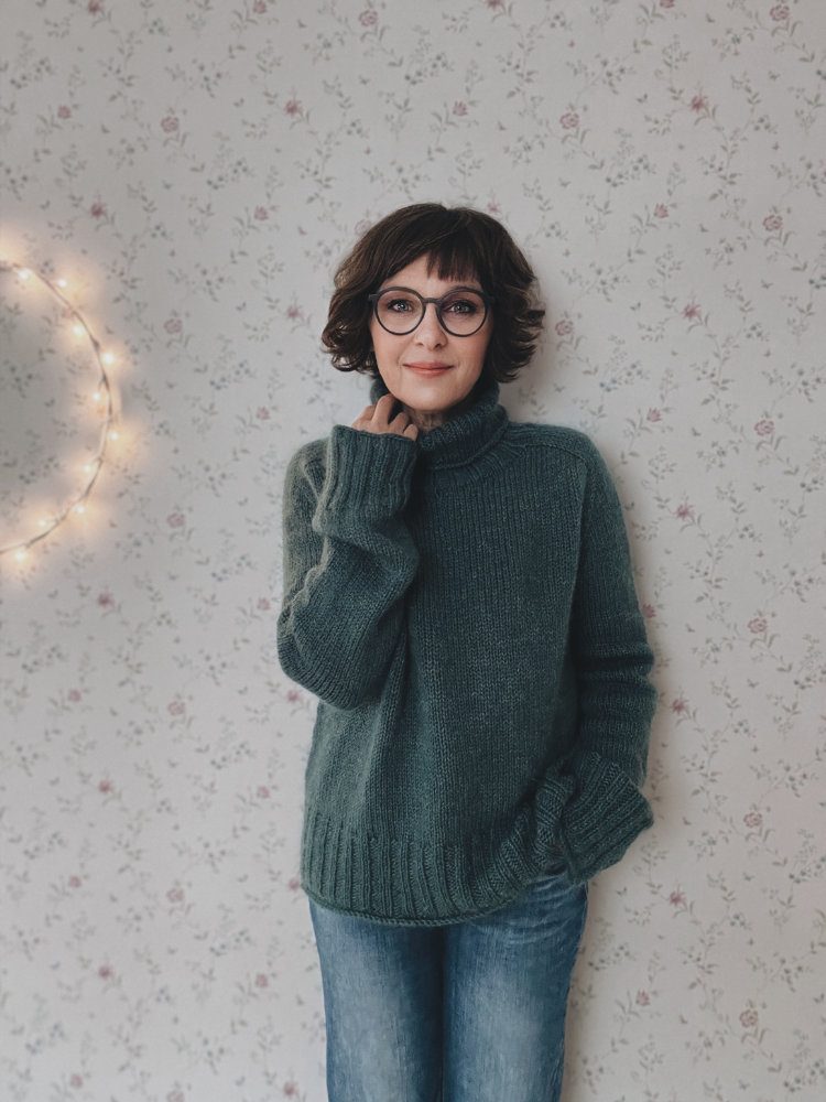 Der Truudi Sweater ist ein klassischer Unisex-Rollkragenpullover mit Sattelschultern und einem etwas weiteren Rumpf. Truudi wird glatt rechts von oben nach unten ohne Nähte gestrickt. Der Sweater hat einen wunderbar warmen und weichen Rollkragen, den du in der Länge individuell anpassen kannst. Der Ausschnitt wird mit verkürzten Reihen (German Short Rows) geformt, gleichzeitig wird die Sattelschulter mit nach rechts und links geneigten Maschen in Hin- und Rückreihen gearbeitet. Dann wird in Runden gestrickt. Zunächst werden die Ärmelzunahmen, dann die Raglanzunahmen mit nach links und rechts geneigten Zunahmen gearbeitet. Anschließend werden die Maschen der Ärmel stillgelegt und der Rumpf in Runden gestrickt. Er endet in einem breiten, dekorativen Bündchen. Die Maschen der Ärmel werden wieder auf die Nadel gelegt und in Runden ohne Abnahmen bis zu den breiten Bündchen gestrickt. Diese werden im Bündchenmuster in Runden gestrickt. Alle Längen des Truudi Sweaters können individuell angepasst werden.