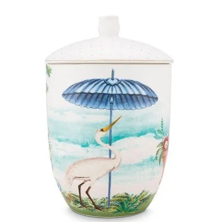 Dieses schöne Vorratsgefäß aus zartem Porzellan ist mit einem Reiher unter einem Regenschirm und einigen tropischen Pflanzen versehen. Diese tropische Stimmung wird mit einem bewölkten Hintergrund und einem weißen Deckel mit goldenen Punkten kombiniert.